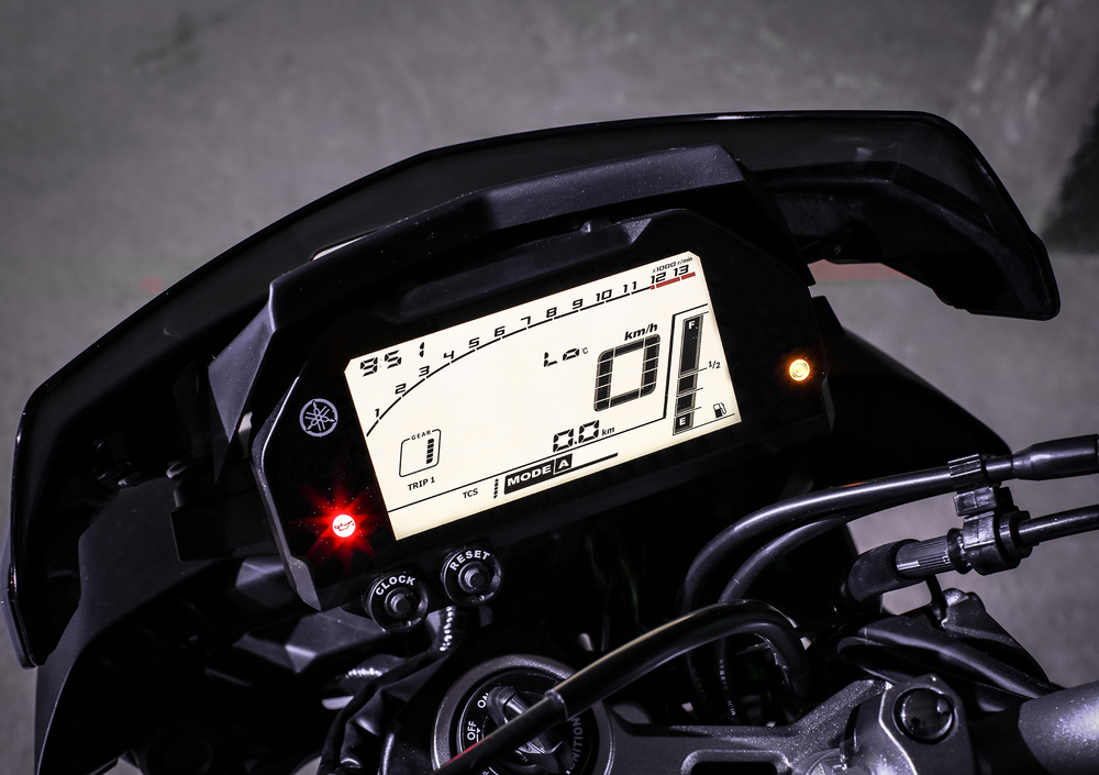 Quello che non incontra i nostri gusti sono piccoli particolari che purtroppo ci si trova spesso davanti agli occhi, come i vari cavi e cavetti che passano disordinatamente sotto il cruscotto, o il tappo del serbatoio d'espansione del liquido di raffreddamento, con relativo sfiato, che non spiccano per raffinatezza. Piccole ombre in un complesso che per il resto è all'altezza della tradizione alla quale ci hanno abituato le moto costruite a Iwata. Bella e funzionale la strumentazione LCD, leggibile e completa, sono infatti numerosi i parametri visualizzati. Tachimetro e contagiri, orologio, temperatura liquido raffreddamento e rapporto inserito sono sempre sott'occhio, mentre i consumi medi e istantanei, ed i contachilometri parziali e totale, si possono visualizzare in sequenza agendo su un tasto alloggiato sul blocchetto sinistro.