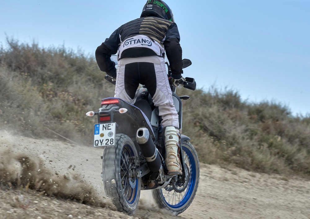 Andiamo subito al sodo. La Yamaha Ténéré 700 ti mette a tuo agio - soprattutto se superi il metro e 70 - perché è agile e leggera tra le gambe. Siamo sotto i 200 kg senza il pieno di benzina ed è un grande risultato. Stai bene in sella, grazie ai comandi morbidi e al bel feeling che si instaura nei primissimi chilometri. La protezione dall'aria è discreta per il casco e carente per le spalle, ma non ci lamentiamo: per andare in fuoristrada non ci servono grossi cupolozzi che tagliano la visuale del pilota. Meglio uno schermo compatto, che devia l'aria, lasciando però il campo visivo sgombro. Buone notizie in zona confort, dato che le vibrazioni sono praticamente assenti e il motore non scalda per niente. E' bello tra l'altro anche il sound dello scarico. In piedi la Ténéré si guida in modo perfetto, grazie al manubrio largo (che preferiremmo solo un pelo meno incurvato all'indietro) e ai fianchi stretti. Da seduti invece infastidisce un po' la sporgenza del carter destro, che urta il polpaccio. Nulla di drammatico, però bisogna farci l'abitudine.