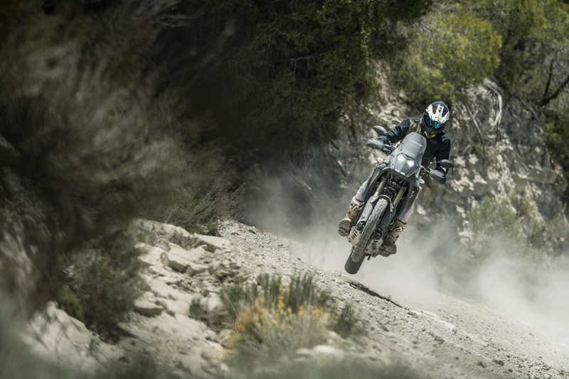 Il telaio a doppia culla in acciaio è completamente nuovo e pensato per offrire prestazioni ma soprattutto resistenza e la giusta snellezza per la guida in fuoristrada. La culla inferiore è imbullonata (al pari delle pedane del passeggero) ed è protetta da una estesa cover in alluminio. Il comparto sospensioni conta sulla forcella Kayaba regolabile con steli da 43 mm ed escursione di 210mm, mentre al posteriore troviamo un monoammortizzatore sempre Kayaba con stelo in alluminio e con regolazione remota del precarico e forcellone in alluminio che definiscono un'escursione ruota di 200mm. Restando in tema di ruote, la dotazione parla di cerchi a raggi con pneumatici Pirelli Scorpion Rally STR dal diametro di 21" (largo 90) all'anteriore e 18" (largo 150) al posteriore con camere d'aria.