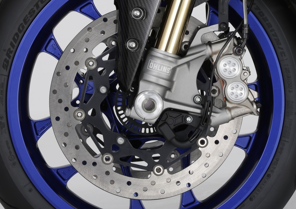 Come scritto sopra, alle sospensioni tradizionali della versione “Standard” - forcella e mono ultraregolabili Kayaba - si contrappongono le sofisticate unità della R1M, quelle Öhlins Smart EC che hanno una logica di funzionamento differente rispetto alla versione precedente, potendo sfruttare un nuovo software e la presenza di dodici sensori: quindi tre in più di prima, due dei quali dedicati al rilevamento della pressione esercitata sui dischi dalle pinze, e uno che legge la velocità della ruota anteriore. Le differenze sono percepibili nei setting predefiniti, ora denominati T-1 T-2 R-1 (prima erano chiamati A-1 A-2 A-3), sempre collegati ai Riding Mode (A-B-C-D) che invece impostano le modalità di erogazione del motore. Le impostazioni predefinite, che in ogni caso possono essere personalizzate a piacere, non indicano più le funzioni di Estensione/Compressione Anteriore/Posteriore, regolabili attraverso dei click virtuali, bensì delle innovative funzioni Brake-support, Corner-support e Accel-support, che corrispondono alle tre fasi dinamiche di frenata, percorrenza e uscita di curva. Inoltre sono presenti due indicatori che visualizzano rispettivamente il Front Firm e Rear Firm, che in parole povere si potrebbero tradurre con “Stabilità frontale e posteriore”, e che permettono di aumentare o diminuire il supporto nelle fasi neutre di guida, come può essere per esempio quella in rettilineo, magari in presenza di fondo sconnesso o semplicemente ondulato.