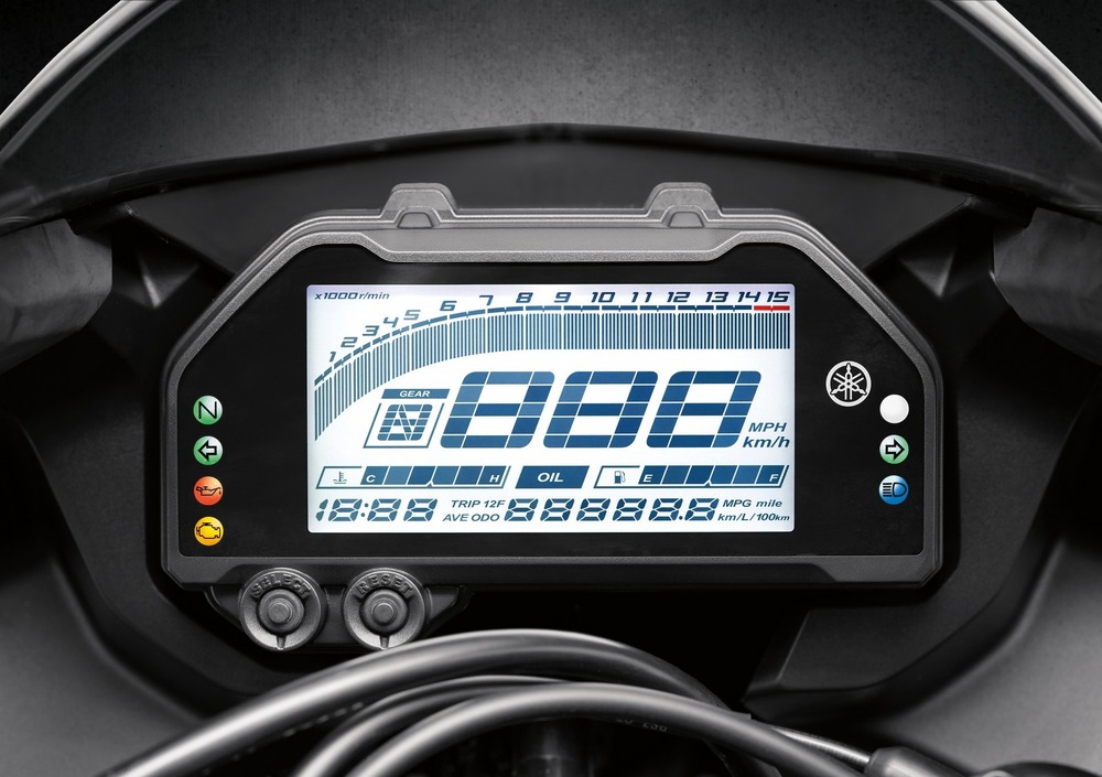 Molto apprezzato il nuovo cruscotto LCD, che riprende il design di quello della R1: il contagiri si distende orizzontalmente, e sono presenti l’indicatore della marcia inserita, il grande il tachimetro, ma anche l’orologio, gli indicatori di livello del carburante e della temperatura dell’acqua, i trip e i valori di consumo.