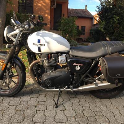 Vendo la mia bellissima Street Twin tenuta in modo perfetto (9.100km) custom; con sellino marrone originale Triumph (sostituito a quello nero di serie) e serbatoio verniciato iridescente, il tagliando è recente. Nel prezzo sono compresi accessori originali Triumph ; barra paramotore e staffe laterali.