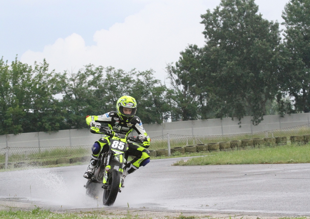 Durante lo schieramento della prima manche smette improvvisamente di piovere e Danilo Aveta, scaltra e fortunata wild card, azzecca la scelta delle slick e domina incontrastato. Lo seguono Contadini, Piccirilli e Vazzoler. Ribaltone nella seconda che vede vittorioso Contadini, con saldato allo scarico Betti che all’ ultimo giro smette di leggergli la carburazione causa involuto errore e conseguente caduta. Il distacco dal gruppetto Aveta – Piccirilli, in lotta per il podio, è così elevato da permettergli di risalire in sella e chiudere comunque secondo. Nella lotta per il gradino più comodo a salire la spunta Piccirilli, ma Aveta dimostra di avere il passo giusto per fronteggiare i piloti più rinomati e veloci della classe.