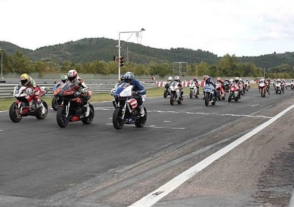Si spegne il semaforo rosso, le due Buell balzano in testa al gruppone.