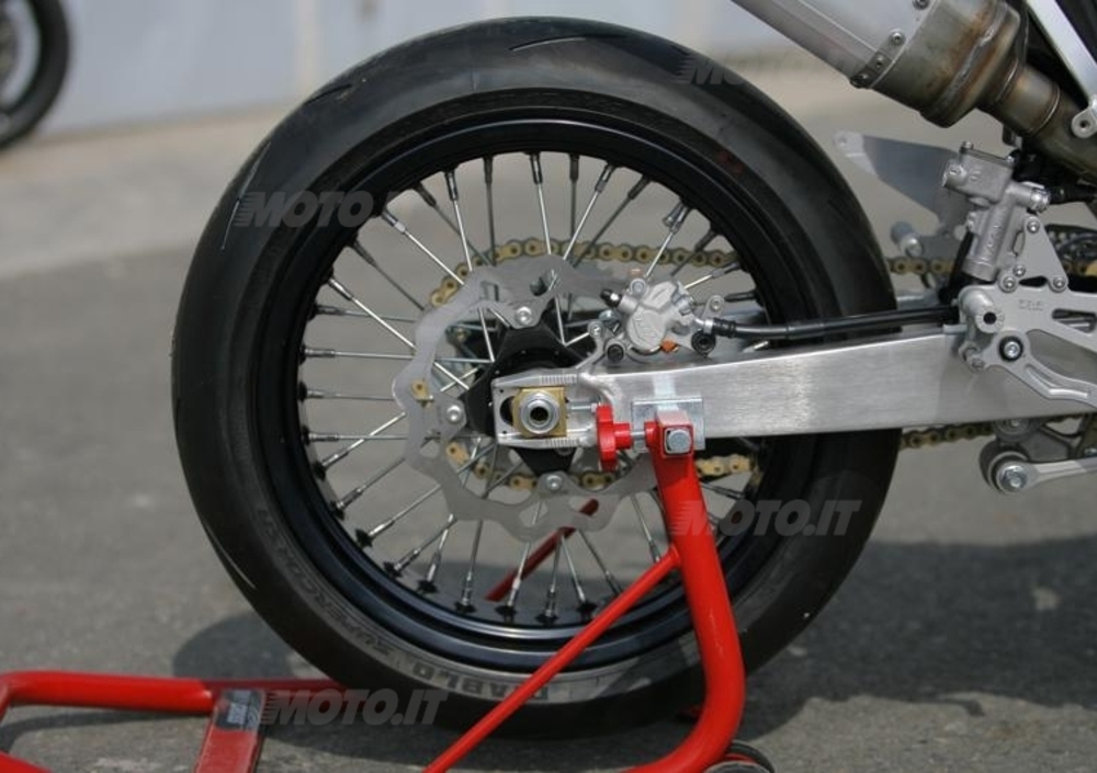 Con 150 euro ti iscrivi alla gara, punto. Non serve nient’altro. Beh, il kit, ovviamente. Se ti procuri una moto da fuoristrada (meglio se jap, ndr) duemezzo di cilindrata o 450, usata o nuova, come vuoi, ti resta fuori il pacchetto di componenti che servono a trasformare la moto in versione supermotard e velocità. Ruote a raggi, pinze freni, sospensioni e tutte quelle parti che servono a “stradalizzare” il veicolo. Prezzo, 4.200 euro più iva. Si corre con monogomma Pirelli, con sette treni si fa una stagione da vincenti, altrimenti possono bastare anche la metà. Categoria Senior per tutti i conduttori che hanno ottenuto la licenza dal 1990 a oggi; categoria Junior per chi la licenza l’ha avuta prima di quell’anno o addirittura si trova a correre per la prima volta.
