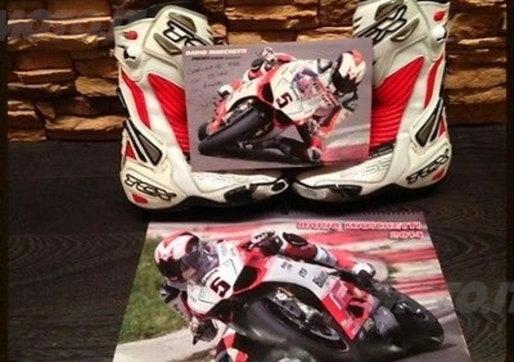 All’asta si possono acquistare infatti una tuta intera in pelle Rewin del vicecampione del mondo Alex De Angelis, gli stivali Dainese del due volte iridato Manuel Poggiali e quelli TCX del «re» delle gare di endurance Dario Marchetti. Il prezzo base parte da € 700,00 per la tuta e da € 100,00 per gli stivali.