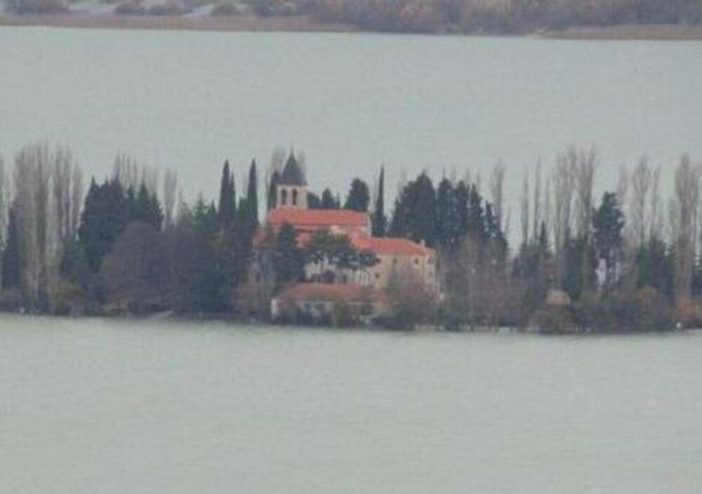 Il lago di Visovac, nel mezzo del quale è presente un isolotto sul cui sorgono un convento di frati francescani, una chiesa e un museo.