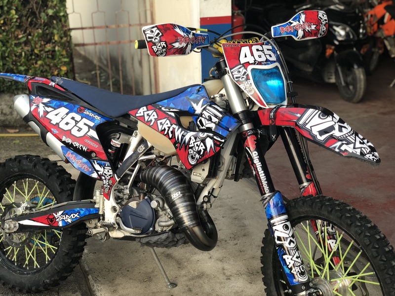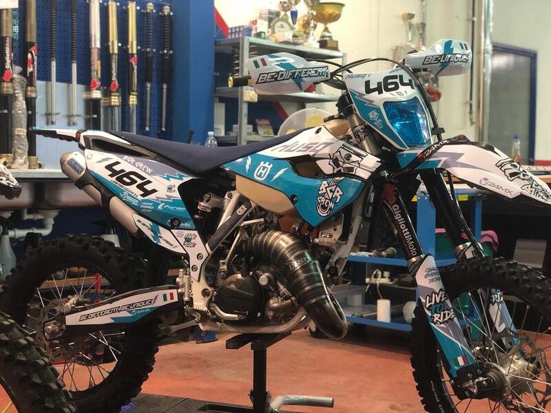 Inoltre altre componenti aggiunte sono: ventola di raffreddamento attivabile tramite pulsante, utile nel caso ci dovessimo bloccare all’interno di zone fangose, protezione disco e rete per radiatori di marca Polisport, leve antirottura Twenty, cinghie 24mx, filtro Funnelweb che grazie alla sua maggiore superficie permette un trattenimento maggiore dello sporco, calze Forksaver utili per evitare danneggiamenti ai paraoli delle forcelle ed infine i coperchi proteggicuscinetti delle ruote marchiati Racecap.