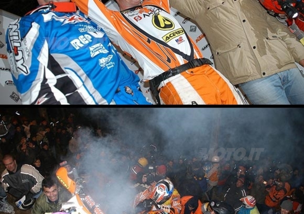 Cinque minuti soltanto, ed anche l’ultima sorgente di luce se ne va, con le batterie «out of order». Di fronte a Knight un giro da incubo. Scivolato alla Salamandra Creek, e piegata la leva del cambio. Per un attimo perso sulla cresta della montagna, poi inabissato in mezzo alle sterpaglie del sottobosco della foresta del Ciocco. Intanto il «nemico» sempre più vicino. Alla cascata il thrilling. Knight cade giù, volando per dieci metri e cappottandosi in fondo al muro di roccia e di acqua. All’ultimo timbro il suo vantaggio è ridotto a sei minuti soltanto. Pochi, in vista dell’ultimo arco prima che si chiuda il cerchio di Camel Hell’s Gate 2006.