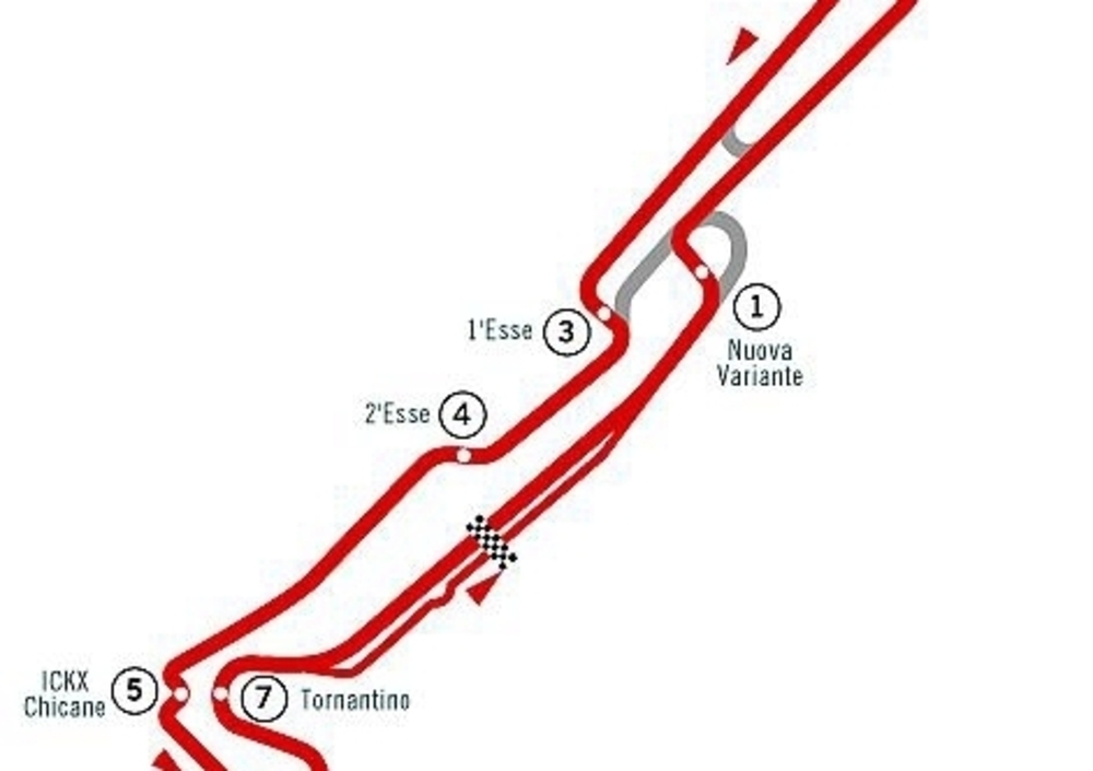 L'uscita dai box ci da il benvenuto nel circuito direttamente sulla NUOVA VARIANTE, quindi dopo il solito sguardo indietro per vedere se qualcuno in staccata ci sta entrando dentro, via in un sinistra/destra molto veloce. Arrivando dal rettilineo, sul quale (sempre con la mia RR 600) si tira la quinta, e, con i rapporti cortissimi, nemmeno tutta (forse 250 e sicuramente 125 mettono la sesta) la variante si affronta in seconda, veloce e rapida in uscita. Nel breve tratto di rettilineo scarichiamo la seconda fino al limitatore pelando il gas per prepararci ad affrontare, sempre in seconda marcia, un'autentica opera di ingegneria: LA PARABOLICA.