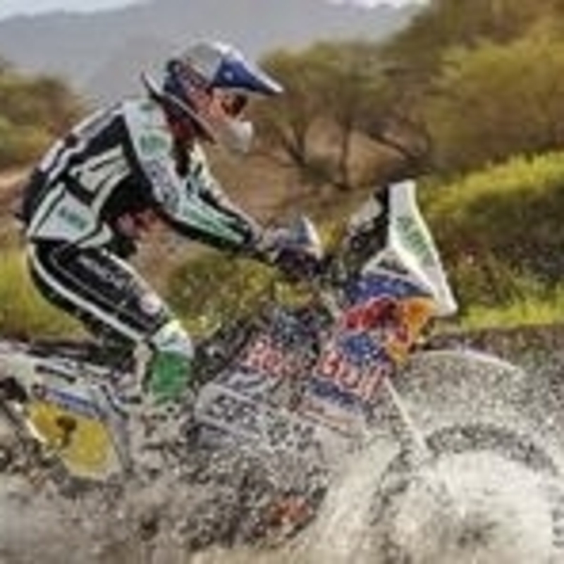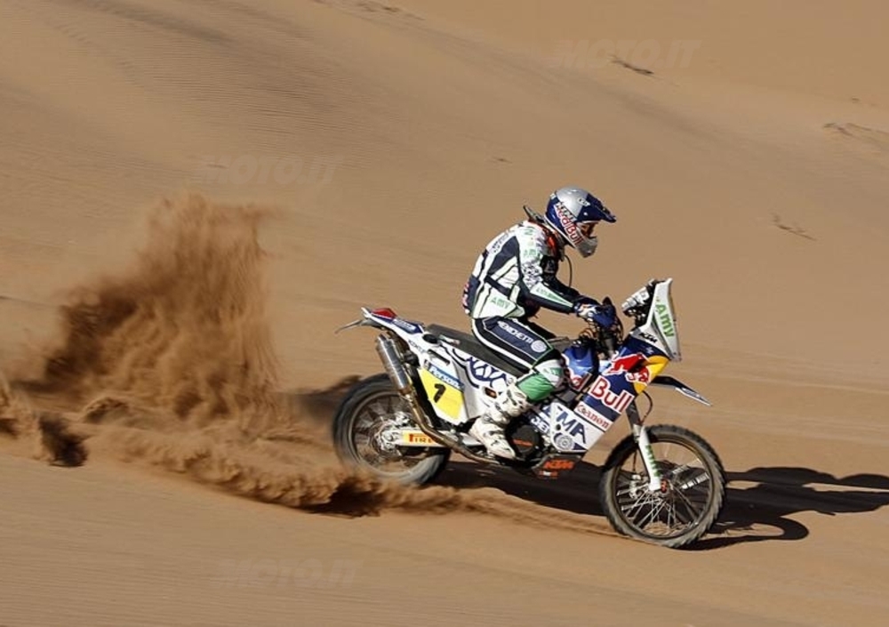 Partenza tutti insieme, per quella che è diventata una manche di motocross di 170 chilometri tra le dune. La partenza in linea, dieci piloti alla volta, è un fatto del tutto anomalo nei Rally, ma per un giorno i “big” della Dakar 2010 hanno potuto lottare gomito a gomito, a vista. Ed ha vinto Marc Coma. Chiaro che con la riduzione del chilometraggio della Speciale e la particolare fomula di gara, ne risulta una classifica senza distacchi, o con margini trascurabili. 4 secondi il vantaggio dello spagnolo su Despres, circa un minuto e mezzo su Lopez e Ullevalseter. Classifica generale invariata, Despres davanti all’olandese ed il cileno. Marc Coma guadagna una posizione.