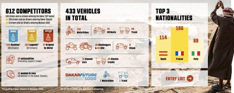 La lista ufficiale dei partecipanti include piloti ed equipaggi di 325 veicoli: 118 moto nella categoria FIM e 207 nella FIA (72 Ultimate, 37 Challenger, 43 SSV, 8 Stock e 47 camion). Ai bivacchi anche i 97 veicoli storici della Dakar Classic (74 auto, 23 camion) alla sesta edizione che affronteranno una gara di regolarità su 7.348 km.
