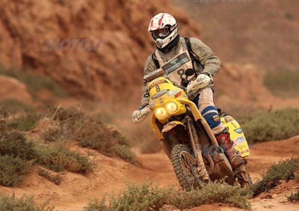 M.G.: "Non è stata una passeggiata. Tanti km, un percorso con tante tappe in Marocco ( pietre, pietre, pietre), la tappa delle dune morte in Mauritania (nel ‘93 alla fine di questa tappa era arrivata solo la Mitsubishi ufficiale), come ho detto prima circa 700 km al giorno. E' necessaria innanzitutto una buona dose di esperienza di guida in Africa , saper navigare con tranquillità anche in solitudine e una buona preparazione atletica fatta nei mesi precedenti. Personalmente non ero molto allenato causa un paio di infortuni nei 2 mesi prima di partire. Ho recuperato l'allenamento strada facendo. Ancor più importante è la preparazione della moto, almeno per un privato come me che deve arrangiarsi da solo prima e durante la gara. Una moto preparata bene permette di ridurre i problemi durante la gara. Personalmente ho cominciato a preparare la moto da zero circa 6 mesi prima con l'ausilio di amici, un meccanico (principalmente per l'assetto) e della famiglia, che ha sopportato tutto! In tutte le gare di questo tipo, sono anche i privati a farne la storia. Sul mio arrivo a Dakar non ci avrei scommesso 1 euro ( non avevo nemmeno prenotato il volo di rientro da Dakar). Se sono arrivato io, penso che sia alla portata di tutti i privati dotati di gran passione e volontà , per non dirla in termini più volgari...".