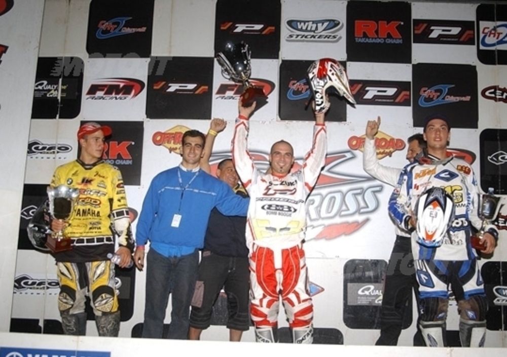 Un successo ottenuto davanti ad oltre cinquemila appassionantissimi spettatori che hanno affollato all’inverosimile le tribune del crossdromo di Finale Emilia (cittadina della provincia modenese) gestito dalla locale Associazione Fuoristradistica Finalese, che per l’occasione ha curato con grande capacità e passione l’organizzazione di questa attesissima finale. E’ stato questo l’ennesimo successo per il fortissimo pilota emiliano vero mattatore di un campionato che ha sorpreso per l’adesione del pubblico e che ha registrato una fortissima crescita tecnica dei protagonisti. Si è gareggiato sempre su tracciati sicuri per i piloti, ma nello stesso tempo spettacolari, la conferma di tutto ciò viene dal fatto che nelle sei prove disputate veramente pochissimi sono stati gli infortuni e non si sono registrati incidenti di rilievo, segno evidente della professionalità del disegnatore e realizzatore della quasi totalità dei tracciati, l’espertissimo Armando Dazzi. Questo senza dubbio è un successo che gratifica sia la Federazione Motociclistica Italiana sia l’Off Road Pro Racing, che ad unisono si sono da sempre impegnati al massimo per la crescita di questa disciplina. Rientrando in cronaca, Davide Dj Degli Esposti si è aggiudicato questa sesta ed ultima prova in programma, portando così a quattro i successi consecutivi stagionali. E, se vogliamo dirla tutta, è stato il vero punto di riferimento per tutti. Eppure per il Bolognese la stagione non era iniziata nel migliore dei modi. Un’opaca prestazione a Latina ed un brutto errore a Carpi lo avevano estromesso entrambe le volte dalle prime posizioni incamerando pochi punti per la classifica tricolore. Il suo più difficile avversario, Alex Cinelli, dal canto suo, stava viaggiando a gonfie vele, forte dei due successi nelle prime due prove. Da Castelletto di Branduzzo (prima gara della stagione disputata su un vero tracciato da Supercross) è però iniziata un’inversione di tendenza per Degli Esposti. Da quel momento in poi il pilota della Suzuki si è letteralmente trasformato, ed in ogni occasione è stato l’uomo da battere per tutti. Alex Cinelli, come detto, è sicuramente stato il più temibile avversario per la rincorsa al titolo tricolore, vuoi, per la grinta e la crescita tecnica dimostrata in pista, vuoi perché è stato presente in ogni occasione. In quest’ultimo round stagionale Cinelli, dopo avere avuto accesso al Main Event grazie al successo nella sua Heat (l’altra è stata appannaggio proprio di Degli Esposti), al via della finalissima tenta una sortita e prende con autorità il comando della gara. La sua è una fuga di breve durata visto che dopo qualche tornata deve cedere la posizione di leader allo scatenatissimo Degli Esposti. Il pilota bolognese da quel momento in poi s’involerà in un’ennesima galoppata solitaria al comando, cercando solamente di guardarsi alle spalle per tenersi gli avversari a debita distanza. Alex Cinelli intanto commette qualche piccolo errore che lo penalizza e deve cedere prima ad un’arrembante Mike Valade, giovanissimo transalpino del team JK Racing, e immediatamente anche dopo anche a Fabio Ferrari, altro giovanissimo pilota e vera rivelazione della serata emiliana. Per Davide Degli Esposti la gara si trasforma ben presto in una passerella trionfale, mentre per Cinelli il titolo tricolore si allontana sempre più. Il pilota del team Pardi Royal-Pat infatti, di lì a poco, dovrà cedere anche la quarta piazza a favore del Campione Europeo MX Marco Maddii, quarto sotto la bandiera a scacchi. A Cinelli, oltre la comprensibile delusione per l’opportunità svanita di aggiudicarsi il terzo titolo di Campione Italiano della carriera, resta pur sempre la soddisfazione di aver disputato una stagione ad altissimo livello conclusa con un ambitissimo titolo di vice campione Italiano Supercross, che sommato a quanto fatto vedere sia a livello nazionale che internazionale, non può che confermare il bilancio più che positivo fin qui della sua stagione agonistica. Davide Degli Esposti con quest’ennesimo successo stagionale si è aggiudicato quindi il titolo di Campione Italiano 2006. Il portacolori del team Md Racing ha preceduto a Finale Emilia due giovanissime e splendide sorprese, come il francese del Team JK Racing di Riccardo Boschi Mike Valade, alla sua seconda esperienza assoluta nel nostro campionato, (aveva debuttato a Gioia Tauro una settimana prima) e il giovanissimo portacolori del team Rsc Italia Corse Fabio Ferrari, che mai prima di quest’occasione era stato così convincente e concreto da quando gareggia tra i professionisti del motocross. Sicuramente in futuro sono piloti da tenere in dovuta considerazione e che certamente troveremo in lotta per le posizioni che contano nelle future edizioni di questo campionato. Poco convincente la prestazione nel Main Event dell’americano Bader Manneh, solamente sesto, che ha gareggiato senza cercare rischi inutili, con la mente più rivolta a portare a casa il terzo posto nella classifica di Campionato. Alla fine della serata il pilota di punta del team Rsc Italia Corse ha pienamente centrato l’obbiettivo che si era prefissato. Deludente prestazione, come da lui stesso affermato, in quest’ultimo round stagionale per Stefano Dami. Il Campione Italiano Supercross uscente al via della finalissima è rimasto vittima di una caduta in cui sono rimasti coinvolti anche un altro paio di piloti. Il piemontese portacolori delle FF.OO. è ripartito attardassimo gettandosi a capofitto in una rimonta, ma una ulteriore scivolata alla fine ha limitato la sua prestazione e, pur con tutto l’impegno dimostrato in pista, non andrà oltre il decimo posto. Una posizione negativa che Dami mai ha colto da quanto gareggia nel Supercross, e che purtroppo lo fa scivolare alla quarta posizione nella classifica di Campionato Italiano, preceduto da Bader Manneh di soli due punti. Assenti a quest’ultimo appuntamento due dei piloti più