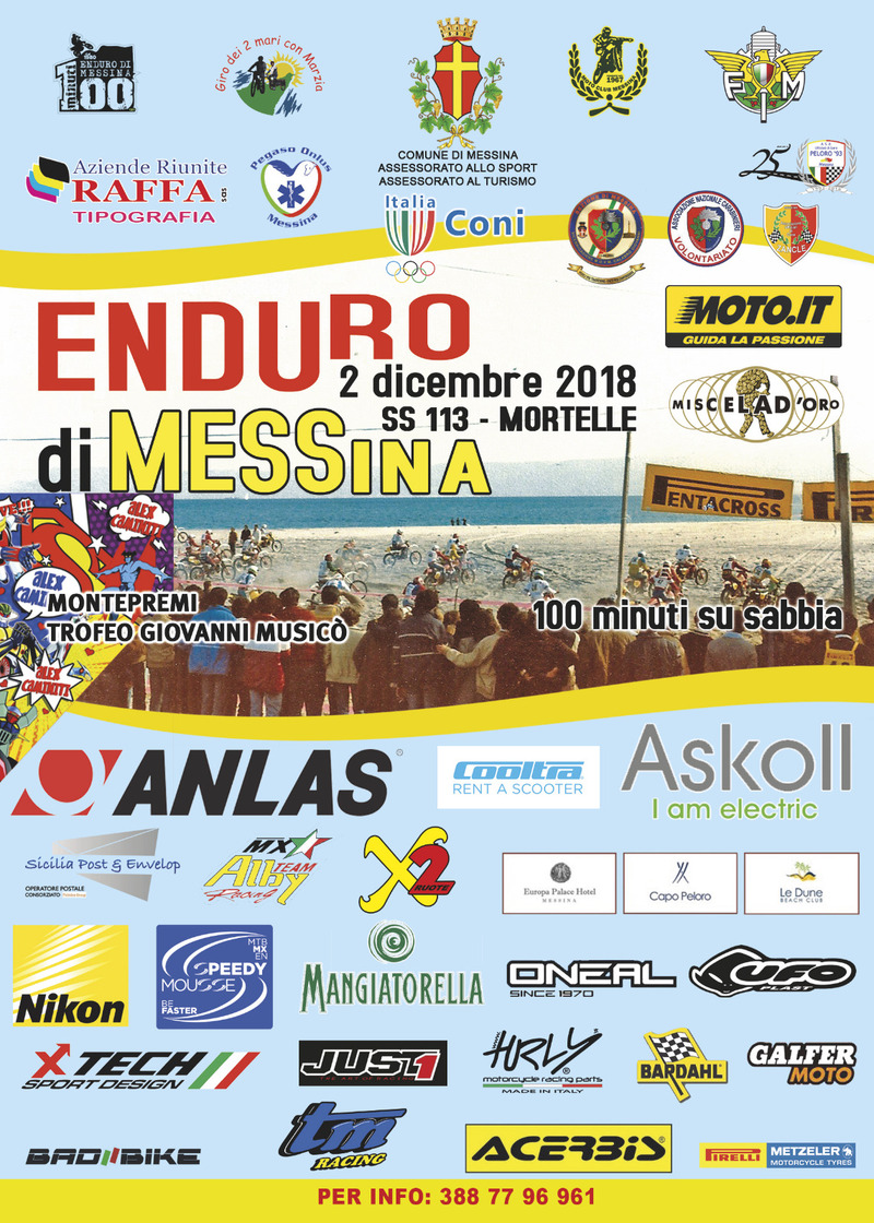 L'organizzatore è Antonio Musicò, un ragazzone che negli anni '80 vedeva le moto da enduro sfrecciare lungo la spiaggia di Messina in una gara di cento minuti; grazie alle munifiche sponsorizzazioni di Pirelli, Maddii, Rinaldi con la Gilera 250, Maurizio Dolce in sella alla Maico, Ivan Alborghetti, Andrea Balestrieri e Mauro Miele sulle mostruose Ktm 500, tanto per fare qualche nome tra quelli più famosi, si sfidavano sulla sabbia siciliana: venne a correre sul litorale messinese anche il grandissimo Fabrizio Pirovano con un'Aprilia 250, prima ancora di diventare il fuoriclasse dei cordoli che tutti abbiamo conosciuto. L'Enduro di Messina 100', nelle sue edizioni di maggiore successo, richiamava quindicimila spettatori.