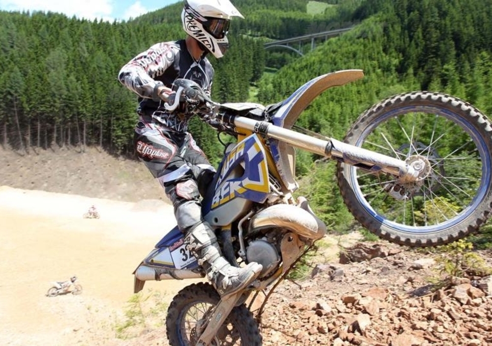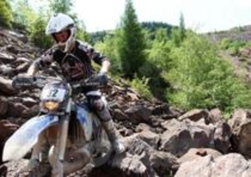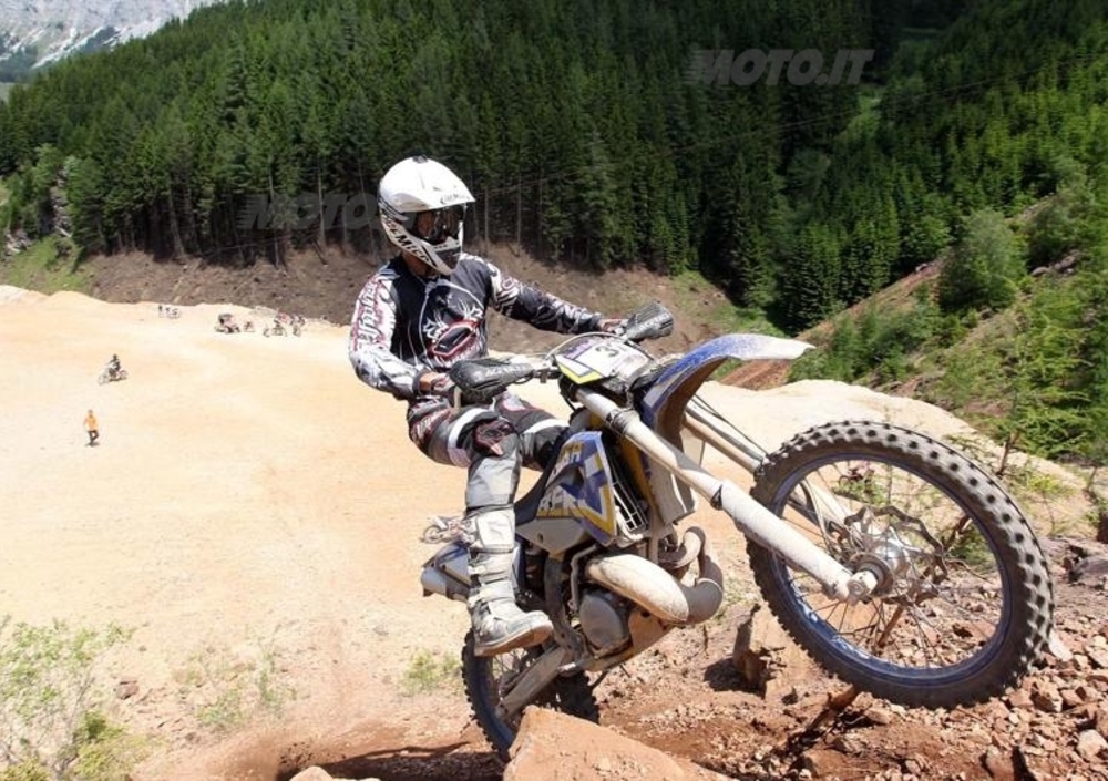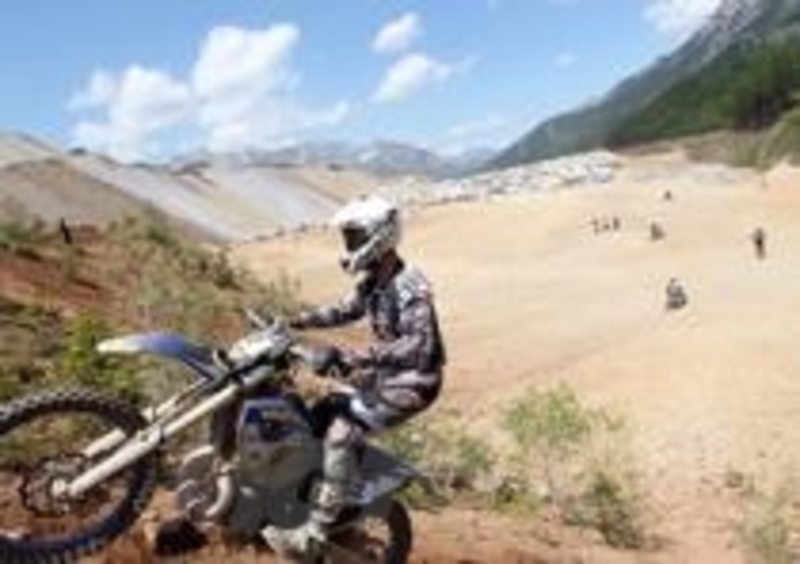 animi. Via! La mia Husaberg non parte subitissimo ed arrivo alla prima curva a metà gruppo, viro e riparto cercando di stare fuori dai guai. A destra si forma nuovamente un bel gruppo, ma data la mia scarsa partenza riesco agevolmente a schivarlo e salire facile. Sinistra e subito a fuoco di nuovo, peggio che in una manche di cross, con l’aggravante che nei primi 100 metri ho già fatto fuori 3 lenti a strappo ed ho le braccia già dure. Via per la seconda salita, la terza e la quarta, poi di nuovo giù ed ancora su. Scorro particolarmente bene, ma le cose a cui devi stare attento sono infinite: la tua traettoria, i sassi che piombano giù, le moto ferme, quelle che scendono, quelle che salgono attaccate a te, il tutto in un caos totale... che bello!!! Ogni salita fatta è una conquista che ti fa salire l’adrenalina alle stelle, ed ogni salita successiva ti riporta immediatamente con i piedi per terra.