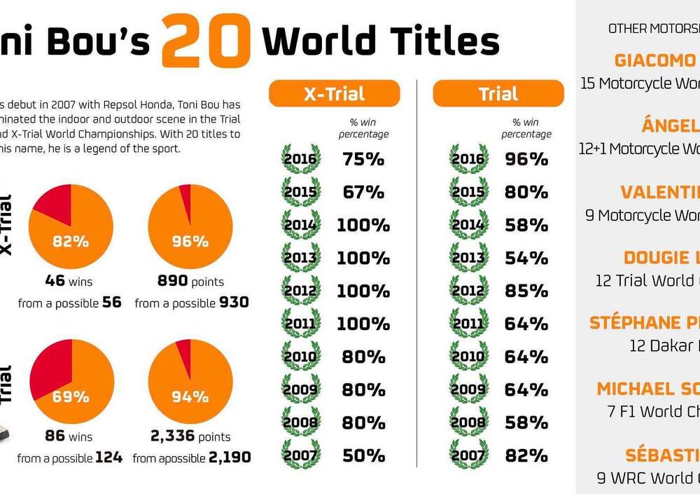 TRIAL GP Dopo la sbornia di festeggiamenti per il decimo titolo conquistato con una manche d’anticipo Dynamite Bou allenta la pressione e nella giornata conclusiva conquista una vittoria più umana concedendosi qualche sbavatura sul percorso solo leggermente modificato in tre sezioni. Al solito è l’inossidabile Adam Raga a prendersi la seconda piazza, mentre un nuovo podio di Jeroni Fajardo chiude una stagione per lui interlocutoria che lo vede perdere due posizioni di campionato in favore di un rinato Fujinami oggi quinto e Albert Cabestany quarto oggi ed in classifica finale. Bellissimo sesto posto per il Campione italiano Matteo Grattarola che con una prestazione convincente degna del suo livello conquista nuovamente la Top Ten finale in una classifica che vede ben sette spagnoli nei primi dieci. Bene anche Gianluca Tournour che ottiene un brillante 14mo posto e conquista finalmente i primi punti nella massima categoria, bravo!