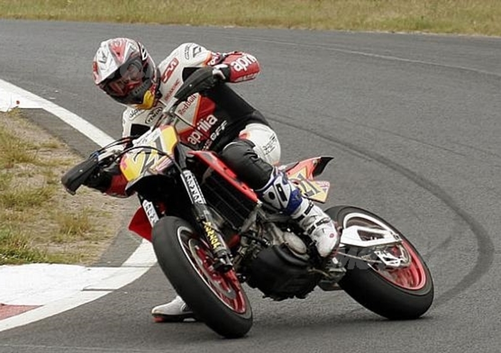 Christian Iddon :”Mi sono trovato subito benissimo con la bicilindrica di Noale. Ha un motore favoloso, non me l’aspettavo (sorride guardando la sua moto, si vede che ne è entusiasta, ndr). È stato facile abituarsi all’erogazione del bicilindrico, si è rivelata perfetta per il Supermotard”.