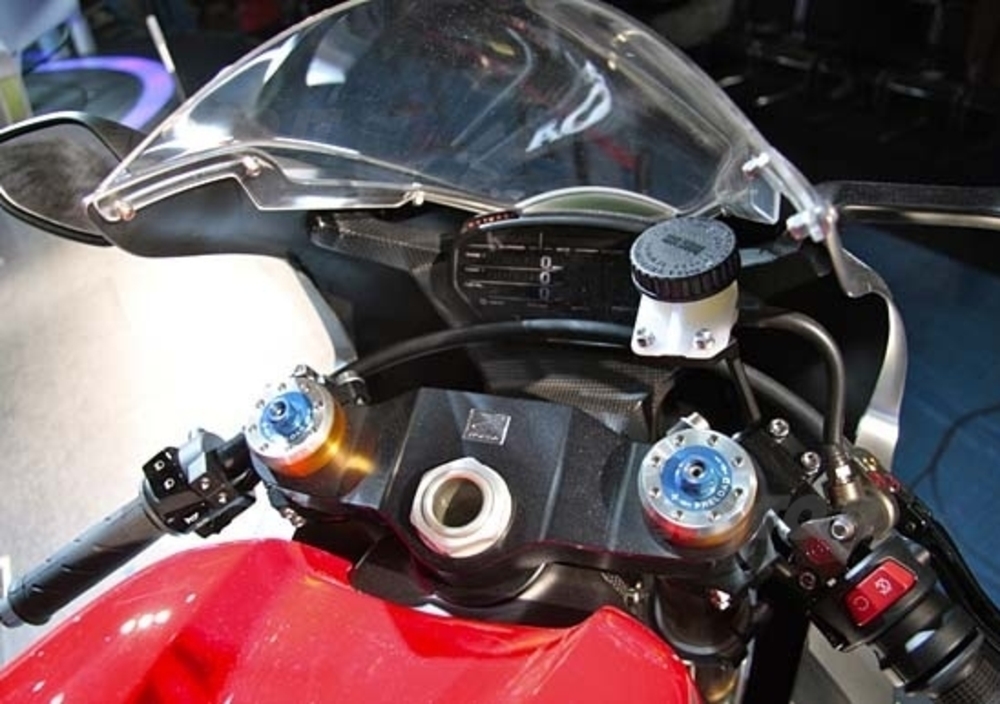 Il telaio è un doppio trave in materiale plastico rinforzato con fibra di carbonio, con il cannotto inclinato di 23°, avancorsa di soli 96 mm e interasse di 1.485 mm. La luce a terra è di 130 mm, e l’altezza della sella di 840. Quanto agli pneumatici, abbiamo un 120/70 anteriore e un 200/55 posteriore, montati su cerchi da 17 pollici.
