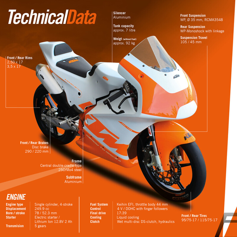 KTM fornirà le moto che saranno uguali per tutti, con specifiche bloccate per alcuni anni in modo di semplificare la gestione dei mezzi e i costi. Il modello è una novità realizzata allo scopo, che sfrutta l’esperienza accumulata dalla casa austriaca durante questi anni nei campionati Red Bull Rookies Cup, FIM CEV Junior World Championship e ovviamente la Moto3 mondiale.