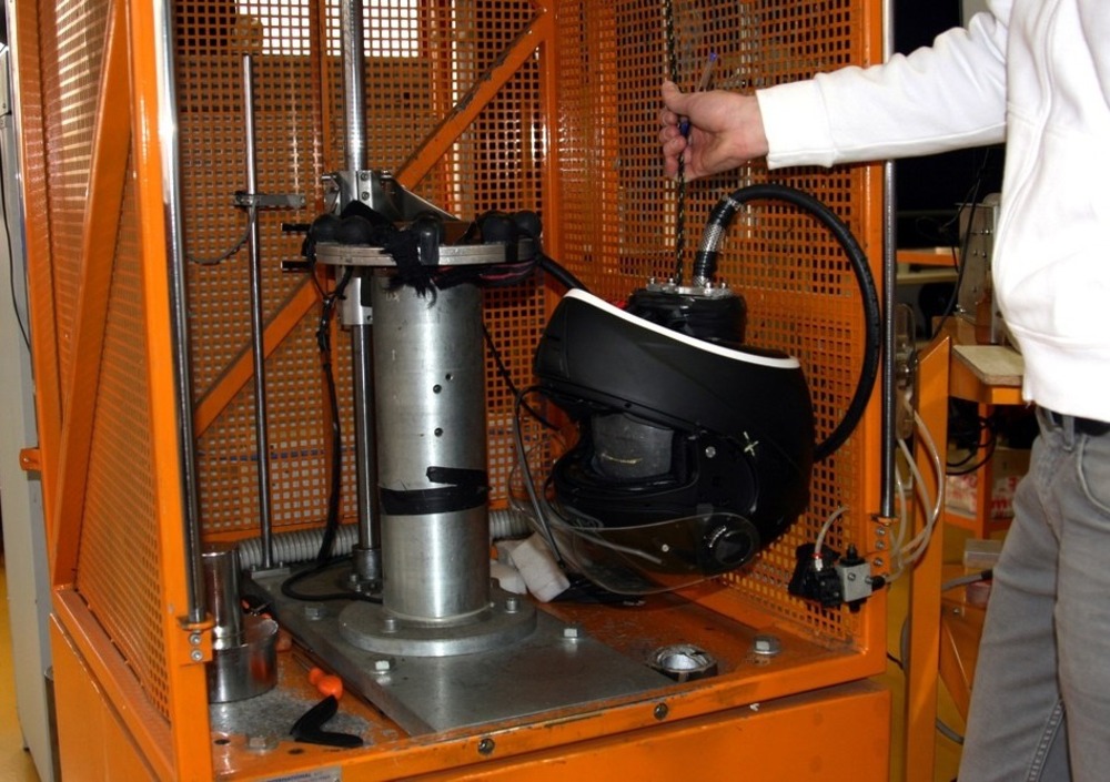 Proseguendo con la comparazione tra le due omologazioni, dobbiamo rilevare che quest’ultima prevede una prova con la stessa macchina test utilizzata dalla ECE, ma ad una velocità più alta: una caduta a 8,2 metri/secondo per la calotta e di 6 m/sec per la mentoniera. Inoltre i punti di impatto sono differenti rispetto a quelli stabiliti dalla normativa Europea.