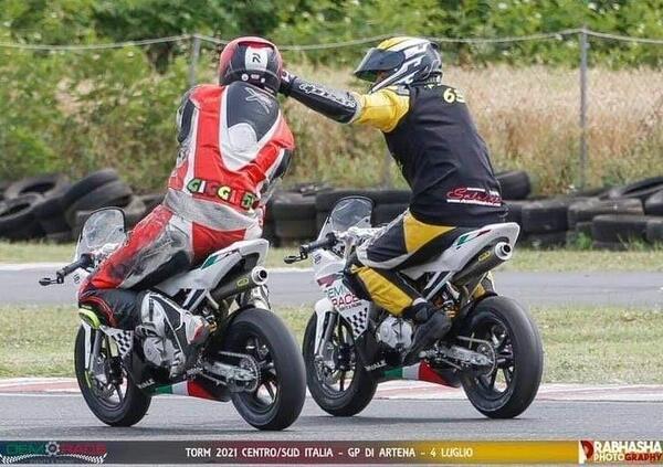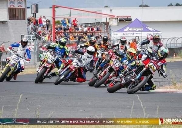 La categoria SUPERMOTARD vede la classica divisione in due classi, partiamo con la classe SMV2 che vede Gianpaolo Orlandi, del team Evolution Bike, partire dalla prima posizione ottenuta con il tempo di 1’.01’’.048’’’. La partenza vede Stefano Punzo del team Boar Racing prendere il comando della gara. Doppia caduta nel primo giro che vede coinvolti Flavio Capecchi del TST Racing team e Cesare Cretaro del team Boar Racing. Punzo riesce subito ad incrementare il margine con gli inseguitori, dietro di lui Massimo Parisi del team Evolution Bike ed Orlandi. Quest’ultimo riprende la seconda posizione e tenta subito di metterla al sicuro incrementando il margine con gli inseguitori. La lotta si accende per la terza posizione con Antonio Perillo del team Boar racing che tenta in tutti i modi di conquistare la posizione di Parisi, ci riuscirà pochi giri dopo. Parisi sembra calare il proprio ritmo e viene attaccato anche da Omar Brill del team Fraffi Corse. Perillo scavalca Orlandi e si mette all’inseguimento del leader della gara. Le prime tre posizioni rimarranno congelate fino alla bandiera a scacchi. Per la quarta posizione invece bisognerà attendere fino all’ultimo giro con Parisi, Alessandro Carini, Alberto Giani del team TST Racing team e Christian Paciotti del Cast16corse by Pizziconi Racing, che rimangono vicinissimi ma senza mai tentare il sorpasso. Punzo taglia il traguardo in prima posizione ed afferma: “Ho avuto un ottimo spunto in partenza, ci voleva proprio questa vittoria l’ho cercata tanto dopo la rottura a Viterbo che ha compromesso il mio risultato”.