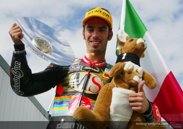 Nel 2001 vince la sua prima gara in 250 in Germania e chiude la stagione al terzo posto in classifica. E siamo al 2002 l’anno nel quale Melandri conquista il suo primo titolo mondiale. Si aggiudica ben 9 gare, ma il suo duello con Fonsi Nieto volge a suo favore solo a Phillip Island quando il ravennate supera lo spagnolo sul traguardo per 7 millesimi e si laurea campione del mondo con una gara di anticipo.