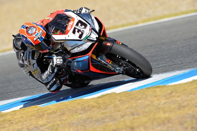 Il 2014 è l’anno dell’Aprilia, che lo vuole al fianco di Sylvain Guintoli. La RSV4 è la moto migliore del lotto, tanto che il francese vince il campionato. Marco inizia a vincere solo a giugno con una doppietta a Sepang. Dalle due gare malesi in poi, il ravennate domina il campionato, ma è ormai tagliato fuori dalla lotta per il titolo e a Magny Cours in Gara1 per ordini di scuderia, deve lasciare la vittoria a Guintoli che è invece in piena lotta per il campionato. Nella gara successiva si rifiuta di far passare il suo compagno di squadra, che vince comunque il titolo mondiale nell’ultima gara di Losail, mentre Melandri termina al quarto posto in campionato.