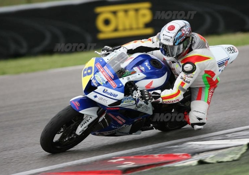 Andrea Zappa è un autentico sportivo: è stato wild card nel motomondiale, corre da oltre 20 anni, ma ora che ne ha 37 ed è titolare di un’azienda e di un team, non ha perso la voglia di lottare con la correttezza e l’educazione che sembrano uno dei principali tratti distintivi della sua personalità. Dopo una scivolata in prova a Franciacorta, nel 3° round del trofeo, classe 600, ha rischiato l’amputazione del mignolo della mano sinistra a causa di una violenta infezione. Si è sottoposto a massicce cure di antibiotici che hanno evitato la soluzione più drastica e, nonostante il dolore, si è presentato a Vallelunga dove ha assicurato il dito malconcio all’anulare. In queste condizioni Zappa ha conquistato una fantastica pole position in 1’45”1: non c’è molto da aggiungere. L’altro protagonista della giornata di qualificazioni è stato il quindicenne romano Emanuele Pusceddu (Yamaha). Reduce da un paio di anni di stop per un incidente ad una spalla e con una lunga esperienza nelle minimoto, iniziata a 5 anni e caratterizzata da alcuni importanti affermazioni anche su moto ufficiali, Emanuele (che ha recentemente “conquistato” anche la licenza media) viene osservato con curiosità e ammirazione. Al 47”2 del primo turno ha fatto seguire uno strepitoso 45”6 che lo innalzato al vertice della sessione pomeridiana. Per il giovanissimo debuttante, tifoso di Rossi e Simoncelli (“mi piacciono solo i piloti italiani”), prima fila dello schieramento di partenza a soli 20 millesimi dal toscano Matteo Antoni (Yamaha), instancabile inseguitore di Zappa; quarto tempo per Giovanni Altomonte (Honda) la cui continuità di rendimento è un segno dell’eccellente periodo che attraversa il pilota.