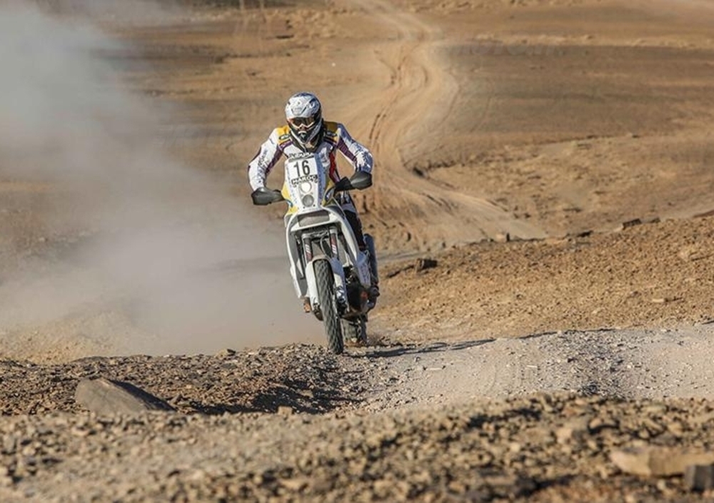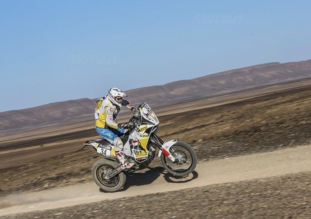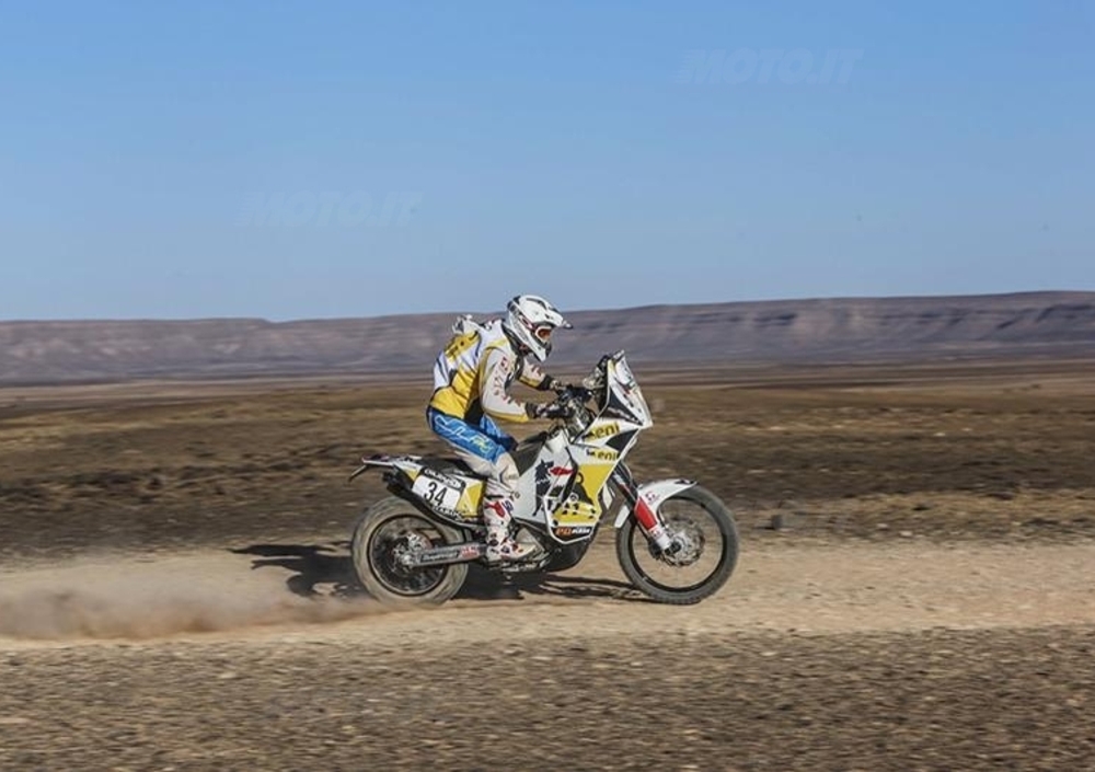 «All’inizio credevo che fosse dura arrivare in fondo, ma che facendo un po’ di dieta, un po’ di jogging e un po’ di moto, alla fine potesse essere abbastanza simile all’enduro della domenica. Invece mi sono reso conto che è veramente uno sforzo sovrumano. C’è una ragazza nel nostro Team, Giada Beccari, non so come faccia. La moto, quando cadi, solo sollevarla ti fa entrare in un loop di stanchezza dal quale non riesci più a venire fuori. La fatica c’è in tutti gli Sport, ma qui è ancora di più. Più vai forte e più è facile, tieni la moto con il motore, la fai galleggiare e non subisci il terreno. Solo che andare forte… non è facile per niente! Oggi, per esempio, la tappa era piuttosto veloce, all’inizio, e noi siamo partiti abbastanza forte. Un bel passo, passavamo gente davanti a noi. Poi siamo entrati nelle dune, quindi in un lunghissimo tratto di fesh-fesh. Dovevamo guidare molto in piedi e ciò nonostante subivamo il terreno. Poi siamo entrati di nuovo nella sabbia, e lì se non vai forte non galleggi, e si ricomincia, t’imbarchi, prendi rischi. Sono venuti a prendere un Pilota con l’elicottero, abbiamo visto una macchina rovesciata. Nel Rally vivi situazioni che diventano drammatiche all’improvviso. Devi sempre pensare che di colpo possa succedere qualcosa per cui tu sei istantaneamente per terra. Rispetto alla pista è più pericoloso, perché i circuiti generalmente sono strutturati anche per la sicurezza. Qui se cadi ti fai male, e devi unire ritmo, velocità, potenza e navigazione. Sì il Rally è lo sport motociclistico più completo».