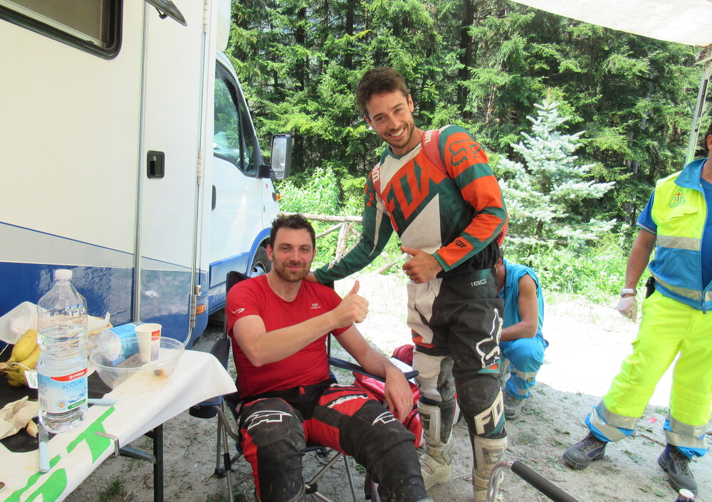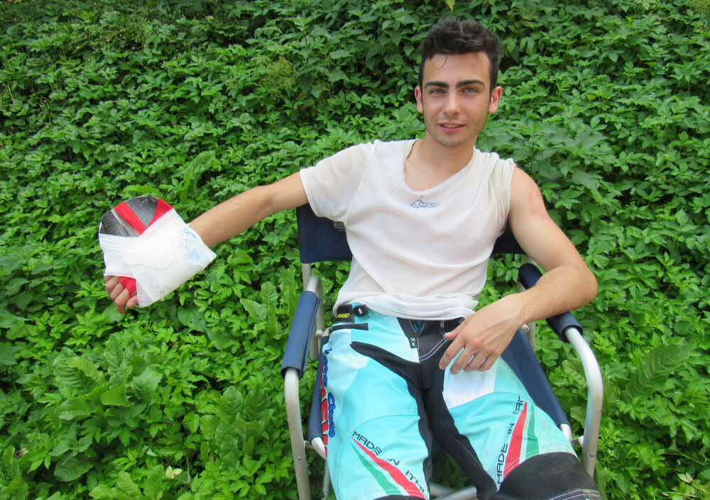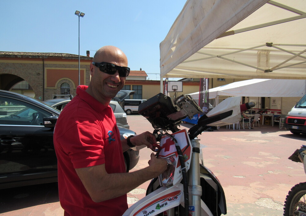 Infortunio per Michele Lombardi giovane ed irruente pilota Fantic. In una spettacolare caduta ha rimediato la frattura del radio. Il soccorso dello Staff Medico è stato prontissimo ed il Doc Gabriele ha immobilizzato l’arto infortunato con quanto di meglio si poteva trovare sul campo: la protezione in carbonio del Porta-Road Book.