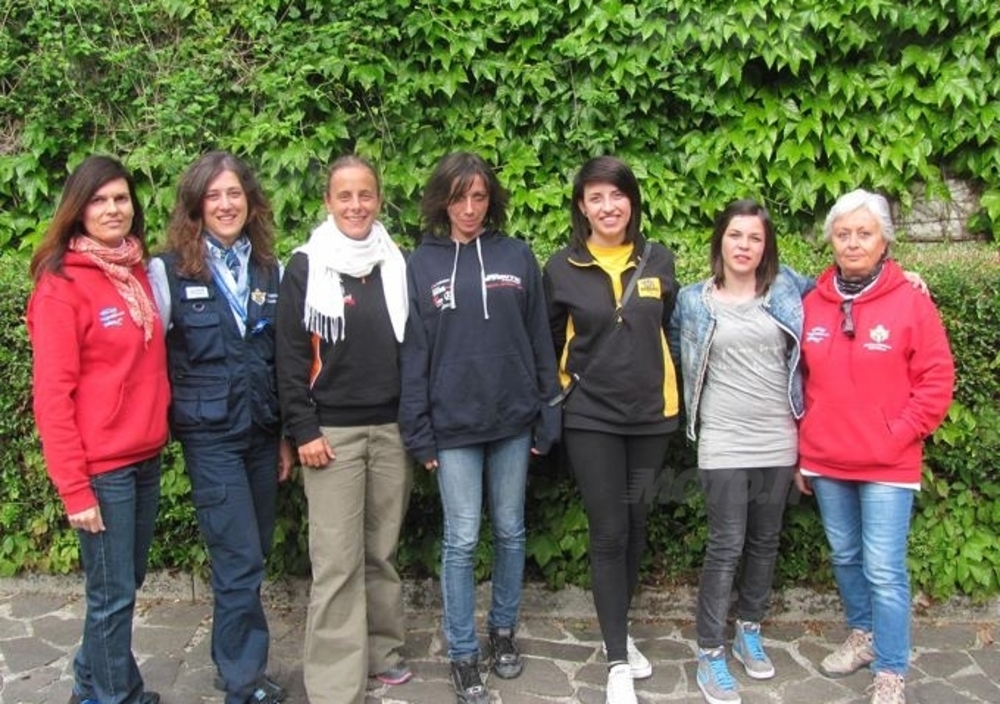 Foto di gruppo per le ragazze del Motorally: Gabriella braccio destro e sinistro del coordinatore Assirelli, Sabrina Commissario di gara, Serena Erika Valentina pilotesse, Sofia addetto stampa e Pina vivandiera e mamma di tutti. Tutte sono l’anima gentile del moto rally.
