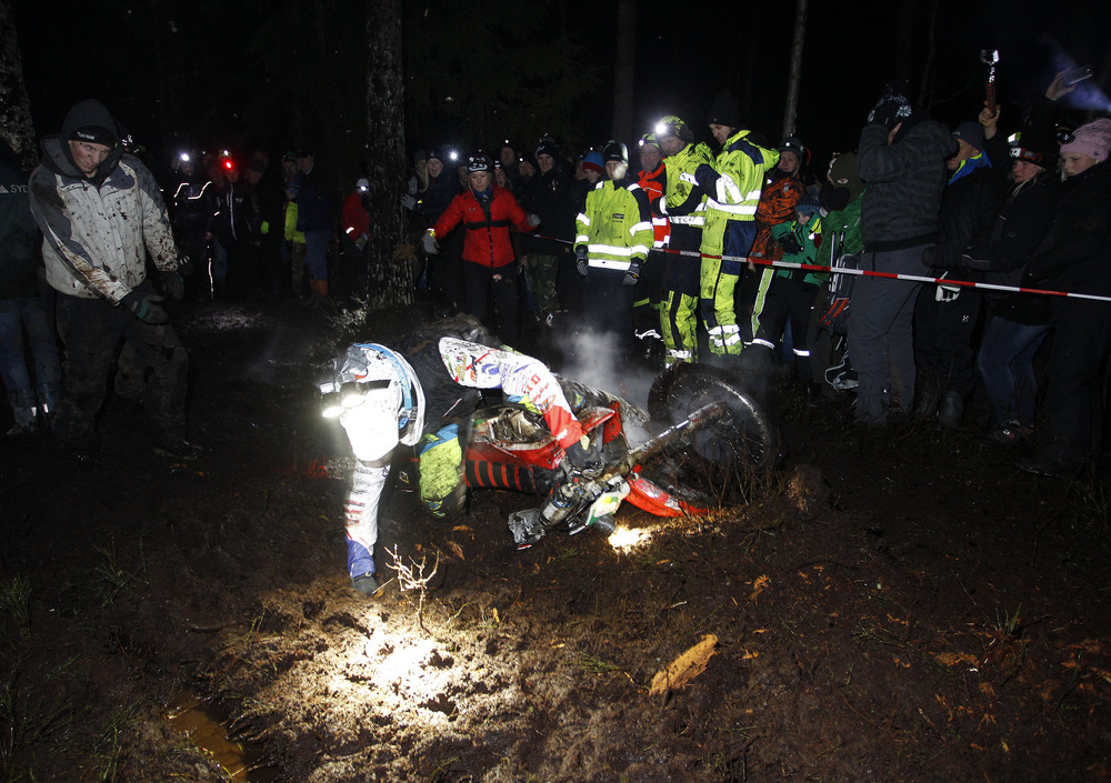 Però comincia a fare freddo, tanto che i piloti ogni due speciali passano per il paddock a cambiarsi i vestiti fradici e gelati. Renet è terzo, a pochi minuti di distacco, nonostante sia partito per la prima PS in ritardo e senza faretti supplementari per un problema elettrico. Una vittoria alla terza speciale con un buon margine lo rimette in gioco. Tutto sembra andare bene quando, al termine della seconda frazione, entra al paddock e si ritira. La tendinite spuntata nel corso della stagione, riacutizzatasi per la fatica, il freddo e l’umido, gli impediscono di continuare. Peccato: fosse finita così ci sarebbero state tre Husqvarna sul podio.