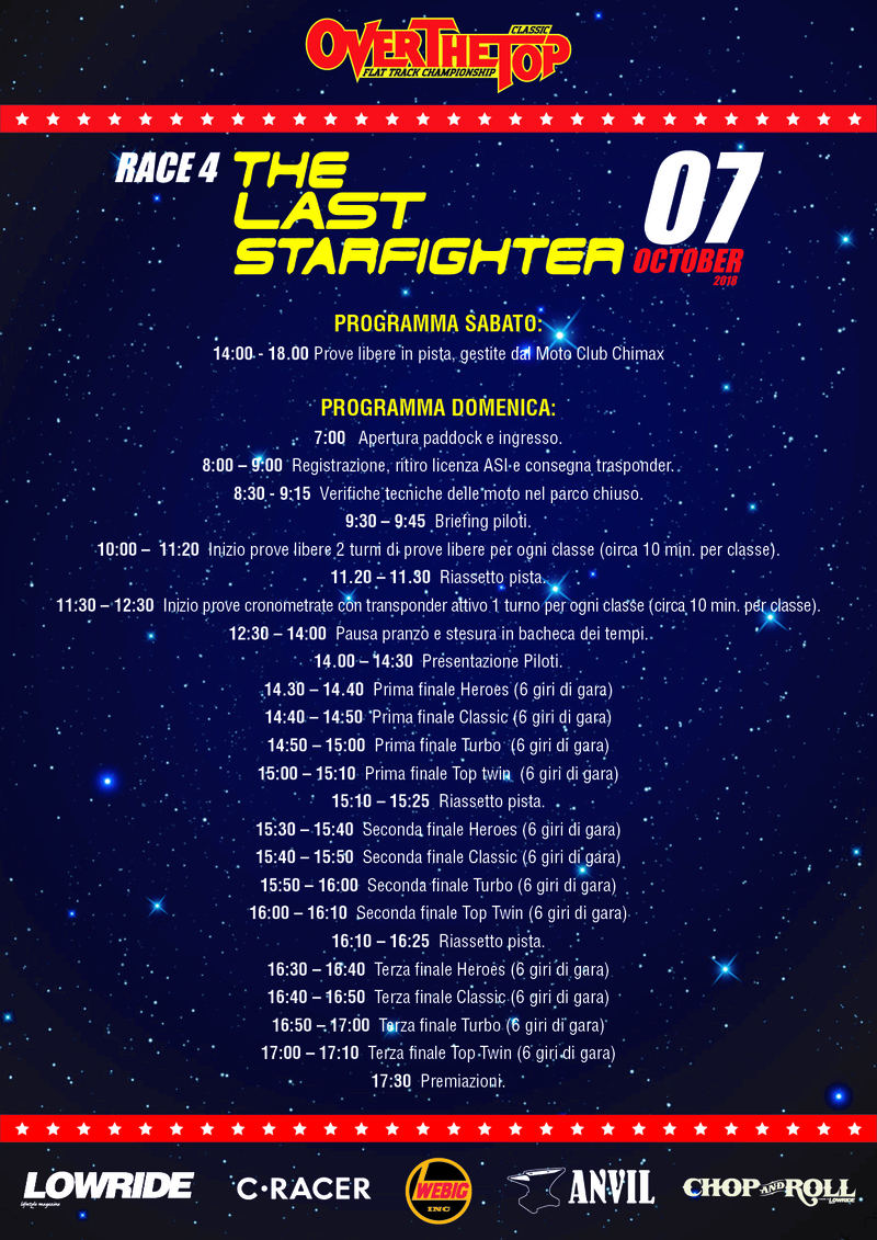 Quarto e ultimo appuntamento per Over the Top, il campionato Flat Track riservato a moto... rigorosamernte non di serie! Tutto corso a Lonigo, sulla pista più prestigiosa del panorama italiano, ha raccolto un buon successo per un'edizione di debutto. Ragion di più per non perdersi la prova di chiusura, che si correrà (sempre sul tracciato vicentino, appunto) domenica 7 ottobre 2018.