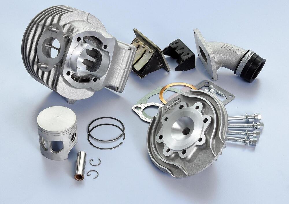 Il kit con immissione “Evolution lamellare” comprende: cilindro, pistone, testa, pacco lamellare, collettore d’aspirazione, serie guarnizioni. Il cilindro è fuso in alluminio con alesaggio Ø 60X54 mm., la canna con riporto Nikel-Silicio migliora lo scorrimento del pistone. Le luci di travaso sono 6. Lo scarico è con traversino centrale per aumentare l’evacuazione dei gas di scarico. Il diagramma di distribuzione è studiato per sfruttare al massimo la potenza di tutti i componenti. La testa è fusa in unico pezzo; migliora la dissipazione del calore grazie a inedite alette anche sotto il piano della testa. Il pistone con due segmenti in ghisa S10 e riporto di cromatura, è in alluminio fuso per gravità con trattamento al bisolfuro di molibdeno. La valvola lamellare è a 6 petali in carbonio di spessore 0,4 mm con geometria dell’inserto guida flusso specifica per aumentare la velocità d’entrata della miscela aria-benzina. Il collettore di aspirazione è alloggiato nel vano originale senza modifiche per utilizzare il carburatore Dell’Orto VHSB Ø34. Per montare questo gruppo termico è obbligatorio barenare la sede dell’albero motore nel carter, sostituendo anche l’albero motore originale con il nuovo Polini codice 210.0070 completo di biella da 105 mm. e corsa 54 mm.