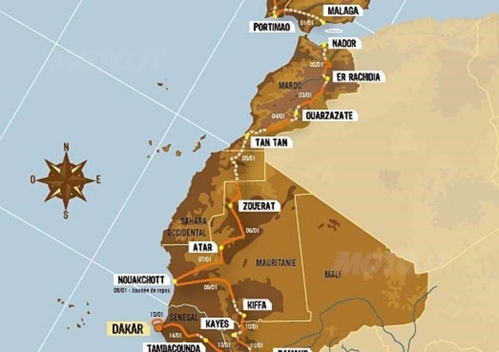 Il percorso, di seguito indicato, si svolge sempre nella parte Ovest dell’Africa. La grande novità è composta dal fatto che si correrà una speciale di 200 Km in Europa, precisamente in Portogallo. Molto utile anche per un ultimo collaudo tecnico prima di imbarcarsi per l’Africa. Di seguito tappe sempre più lunghe e impegnative. Dopo il giorno di riposo un’altra tappa dura e poi il ritmo dovrebbe scendere. Tappe e soprattutto percorsi che non permettono grandi velocità, cercando con questo di abbassare i rischi. L’arrivo a Dakar è previsto il 15 gennaio, dopo essersi sparati sabbia, polvere e sudore per 9.043 Km, di cui 4.813 di speciale.