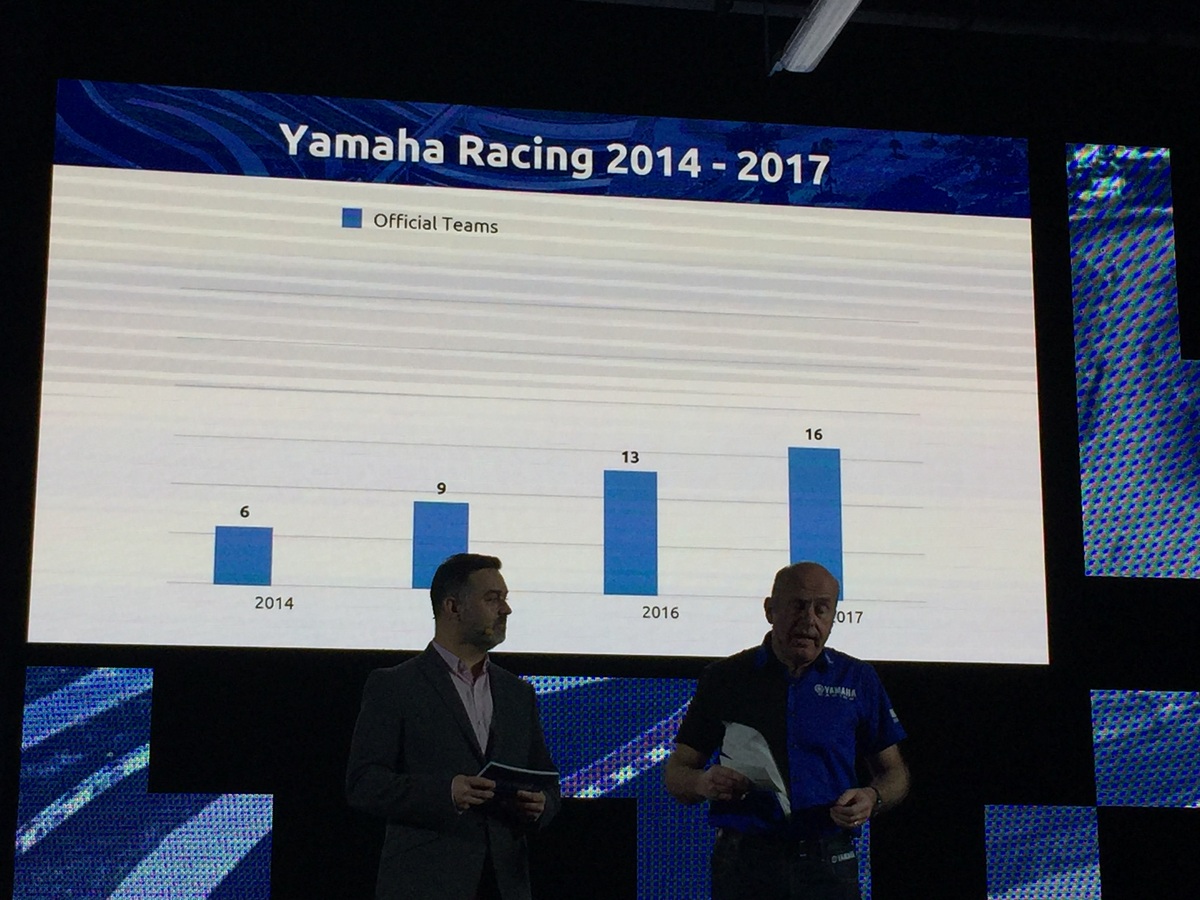 A fare gli onori di casa è stato Eric De Seynes, Chief Operating Officer, che ha tracciato le linee di crescita del settore sportivo Yamaha. La Casa dei tre diapason infatti negli ultimi anni ha investito tantissimo nelle competizioni. I 6 team ufficiali Yamaha nel 2014 sono diventati 9 nel 2015, 13 nel 2016 e nella prossima stagione i team in blu saranno 16. «Cerchiamo di fare grandi cose ad ogni gara. Non solo MotoGP, ma in tutte le discipline - ha dichiarato -. Abbiamo il massimo rispetto per tutte le classi e per tutti i piloti».