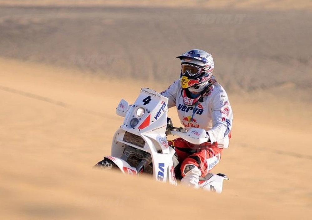 Joan Barreda, in testa dal primo giorno di gara, ha completato con la giornata di oggi il suo ciclo universitario alla Scuola Superiore dei Grandi Rally, e domani verosimilmente uscirà dall’ateneo egiziano con una laurea a pieni voti. È andato in testa, ha attaccato per consolidare il vantaggio, ha vinto una tappa andando in fuga in perfetta solitudine e, finalmente, ha imparato a gestire una tappa da leader, controllando le risorse e gli avversari. Alla partenza era logico attendersi una grande giornata per il polacco Przygonski, ed il polacco, partito alle spalle di Barreda, ha attaccato subito ed è andato a riprendere un leader rilassato, per poi allungare a concludere con il miglior tempo, seppure di poco inferiore a quello di Barreda. Tutto, in un certo senso, logico, prevedibile. Di anomalo c’è solo la prova opaca e “pericolosa” del compagno di squadra di Barreda, Paulo Gonçalves. L’irruente portoghese, in luogo di proteggere le spalle del capo squadra, è partito su una pista sbagliata, intorno al KM 70, e si è perso su una pista che non portava da nessuna parte, percorrendo una quarantina di initili chilometri, quanto sono bastati a Gonçalves per rimanere senza benzina più avanti. Globalmente, non è certo il tipo di “collaborazione” che un leader possa auspicare, per esempio in una gara come la Dakar dove ogni aspetto tattico deve essere curato in modo maniacale, ma è certo che l’episodio darà al Team Manager del Team Husqvarna-SpeedBrain utile materia di riflessione.