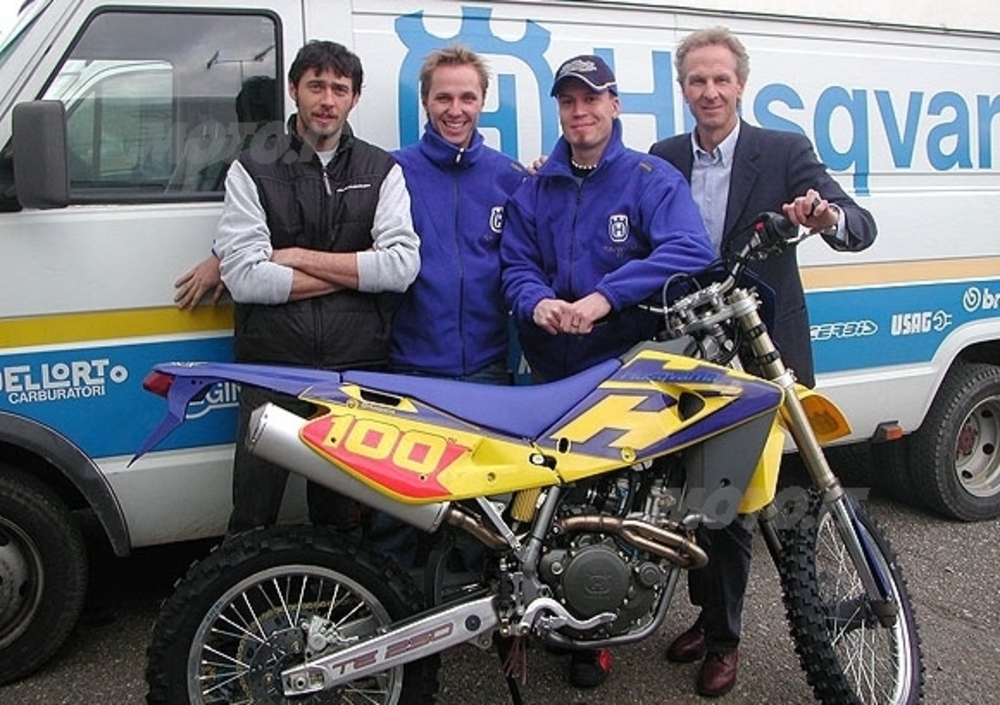 Fabrizio Azzalin (team manager Ch Racing), Peter Bergvall, Mika Ahola e il responsabile delle attività sportive Husqvarna Martino Bianchi.