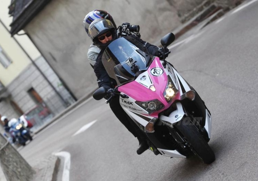 Sullo Stelvio ma in particolare sulla presa del Passo Mortirolo scelta quest'anno, la passione si poteva addirittura toccare con mano: per centinaia di metri prima del Gran Premio della Montagna, su rampe dalle pendenze disumane (in alcuni punti, in due, ha avuto il suo bel da fare anche il T-Max...), migliaia di persone hanno segnato in modo sempre più deciso i contorni di una salita strettissima, abbracciando noi e il nostro T-Max griffato Giro d'Italia con un calore che a noi, che in fondo eravamo solamente degli ospiti di Yamaha e della Corsa, ha sinceramente fatto venire la pelle d'oca. Grande pubblico, grandi emozioni,