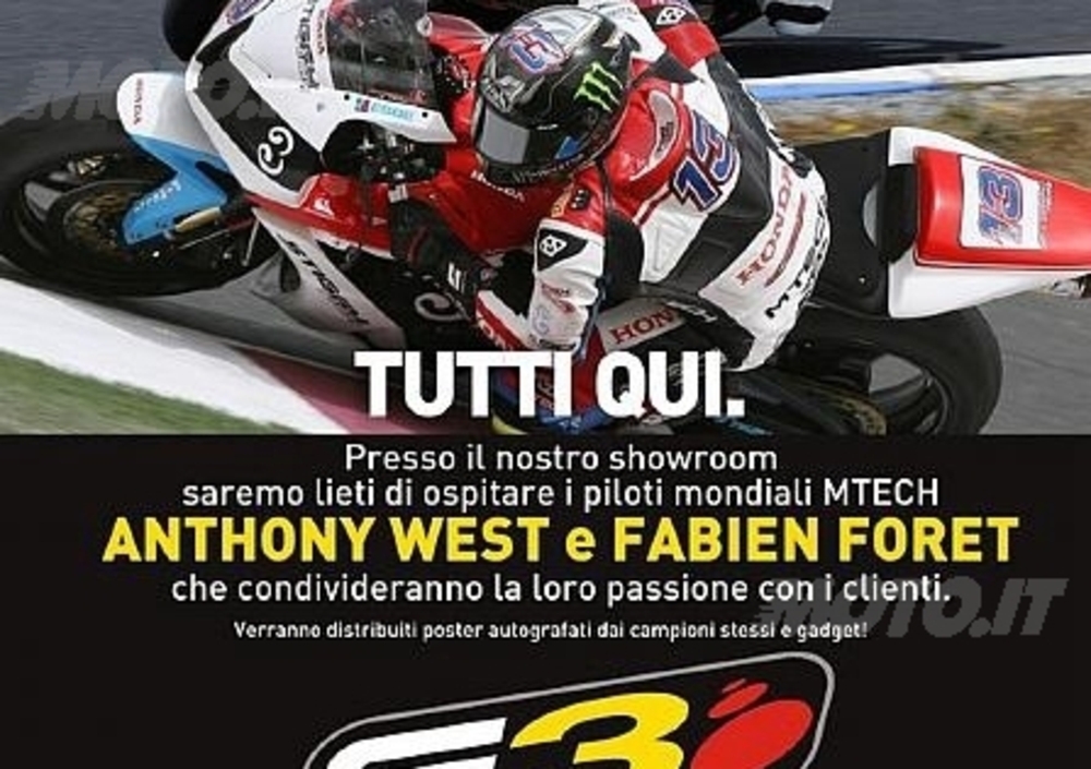 West e Foret, che corrono rispettivamente su Honda e su Yamaha e che si sono affidati a MTECH per l'equipaggiamento, incontreranno venerdì 8 maggio alle ore 18,00 i loro tifosi e tutti gli appassionati di motociclismo presso il punto vendita G3 di Seregno (Milano).