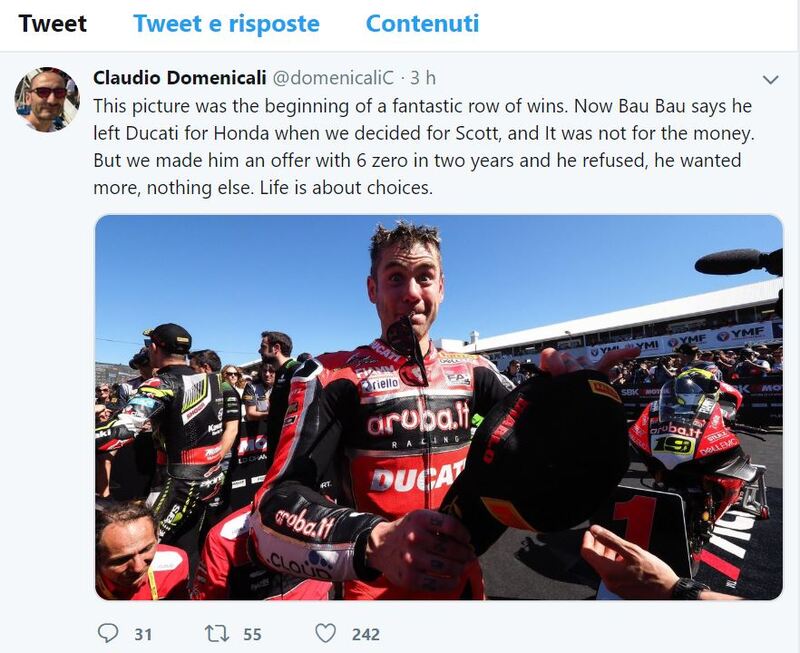 “Questa foto è stata l’inizio di una fantastica serie di vittorie” ha scritto Domenicali. “Ora Bau Bau dice che ha lasciato la Ducati per la Honda quando abbiamo deciso per Scott, e non era per i soldi. Ma gli abbiamo fatto un’offerta con 6 zeri per due anni e ha rifiutato, voleva di più, nient’altro. La vita è fatta di scelte.”