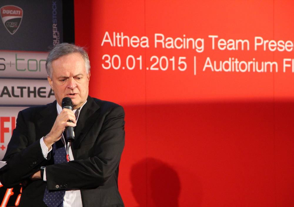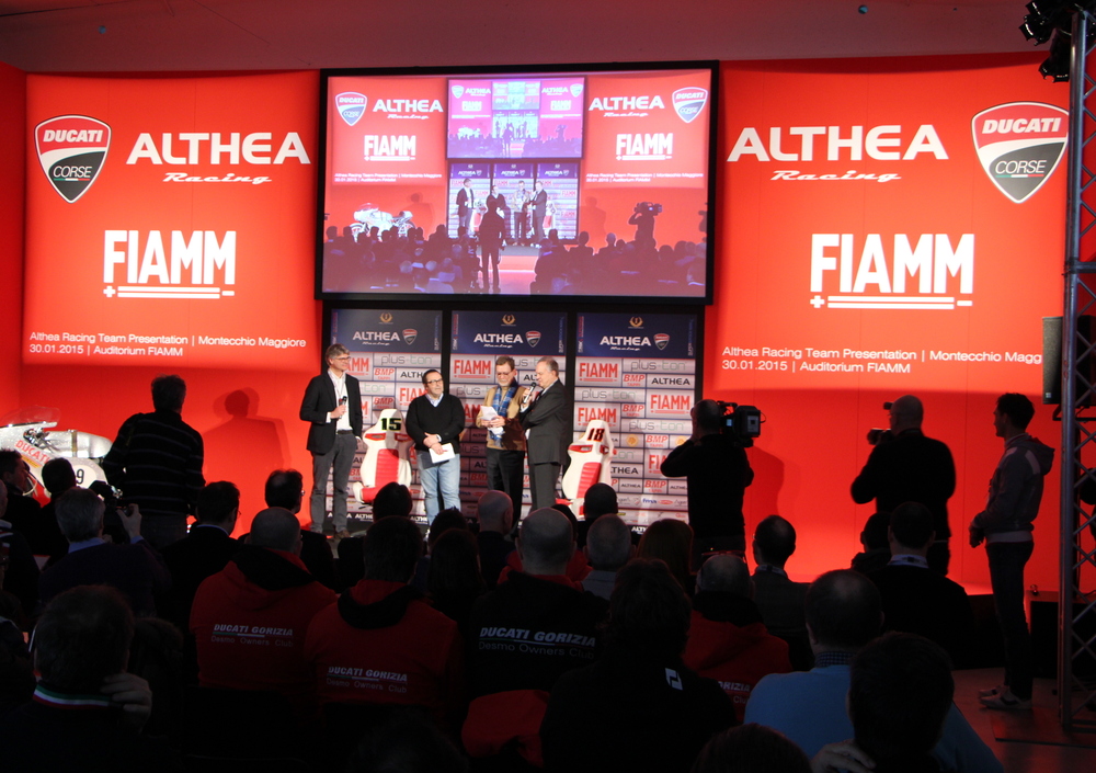 La presentazione del team Althea Ducati, svoltasi presso la suggestiva sede del nuovo sponsor FIAMM, è stata l’occasione per sentire dalla viva voce di Genesio Bevilacqua quali saranno i programmi per il 2015. Sempre con Ducati, Casa che il team di Civita Castellana ha portato al top della categoria EVO l’anno scorso, e con una line-up di piloti in gran parte nuova.