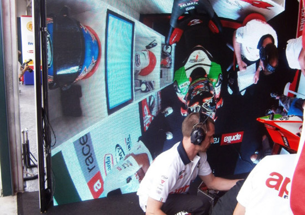 Lo show è iniziato. Il progetto “Max is back” ha avuto il suo inizio pochi minuti fa al Misano World Circuit. Un mega pannello all’interno del box ci mostra Max da diverse angolazioni e da domani decine di microfoni ci riporteranno anche le impressioni del pilota romano sia in pista, da dentro il suo casco, sia nei suoi box a confronto con i tecnici dell’Aprilia Test Team. Grande l’impegno di Mediaset con uno staff di oltre 30 tecnici per un evento mediatico senza precedenti.