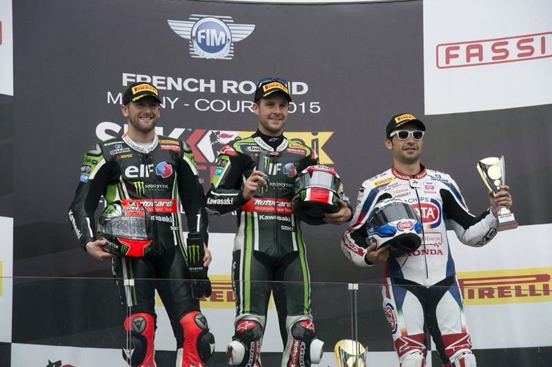 Che piova o ci sia il sole quest’anno le Kawasaki non le batte nessuno. A Magny Cours la pioggia ha smesso di cadere a poche ore dall’inizio di gara 1, ma la pista era ancora molto bagnata e questo ha fatto si che tutti i piloti montassero gomme rain, pur con l’incognita di non finire la gara nel caso la pista si asciugasse in fretta. Va anche detto che la gara è stata ridotta di due giri ed è partita in ritardo, perché nel warm up Reiterberger ha innaffiato la pista d’olio e c’è voluto del tempo per sistemarla.