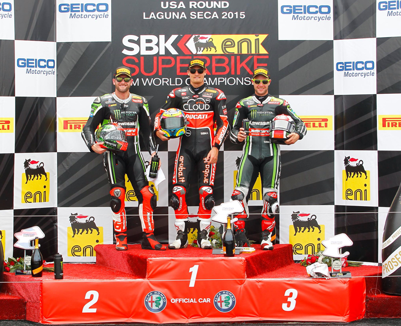 Grandissima gara di Chaz Davies a Laguna Seca, che parte in testa e spinge come un matto, tanto da tenersi dietro i due piloti Kawasaki, ad iniziare dal cannibale Rea, che oggi raccoglie il suo peggior risultato stagionale, un terzo posto che però di fatto gli fa fare un altro passo verso il titolo mondiale.
