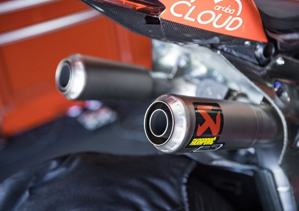 «Con questo impianto di scarico Akrapovic a due terminali utilizzato ad Aragon - ha proseguito Marinelli – disponiamo di una maggior potenza del motore agli alti regimi e di una migliore erogazione che sia Davies che Giugliano hanno apprezzato. Siamo soddisfatti, ma il lavoro di sviluppo che stiamo portando avanti con il nostro fornitore non si ferma certo qui».