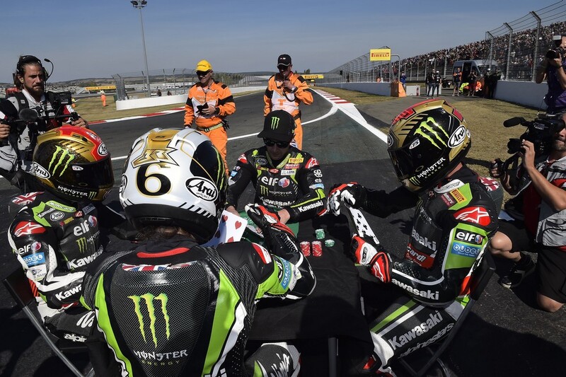 E’ stata la giornata di Jonathan Rea, come ha giustamente detto anche Tom Sykes. Una gara dominata, la sesta vittoria consecutiva, il quarto titolo mondiale consecutivo e un altro record: eguagliato il numero di 130 podi in Superbike di Troy Corser, con molte probabilità di batterlo già nella giornata di domani. Un vero schiacciasassi, ma anche un bravo attore a giudicare dalla scenetta della quale si è reso protagonista nel giro di rientro al box. Rea si è seduto ad un tavolo da poker, al quale ad aspettarlo c’erano altre tre giocatori (tra i quali l’ex pilota Fabien Foret) vestiti con le tute ed i caschi con i quali Johnny aveva conquistato i tre titoli precedenti. Una volta seduto al tavolo da gioco Rea ha giocato i suoi 4 assi e vinto la partita, festeggiando con i suoi quattro complici.