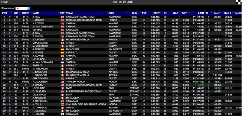 A chiudere in testa alla classifica dei tempi è stato, ancora una volta, il campione del mondo Jonathan Rea. Visti anche i suoi risultati nei precedenti test di Jerez, sembra evidente che la limitazione dei giri motore (da oltre 15.000 agli attuali 14.100) non abbia influito più di tanto sulle prestazioni del nordirlandese, che con il suo 1’41”485 è rimasto sopra il suo miglior giro in Superpole dello scorso anno (e anche al best lap della pista, che appartiene a Sykes con1’41”360), ma vanno considerate le diverse condizioni climatiche, caratterizzate da un forte vento che ha disturbato i piloti specialmente nella giornata finale, e soprattutto il fatto che a Portimão Rea non abbia utilizzato gomme da qualifica. E’ ancora lui il favorito per il titolo mondiale 2018.