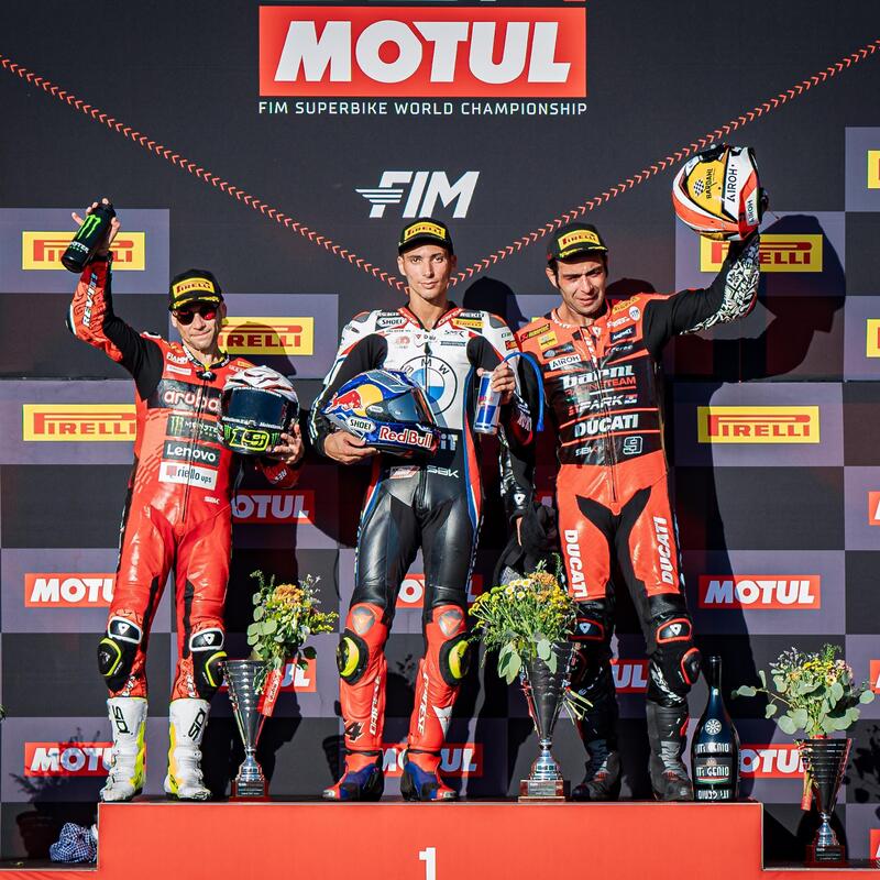 La seconda gara lunga di Portimao ci regala il tanto atteso duello tra Toprak Razgatlioglu ed Alvaro Bautista, ma proprio sul più bello lo spagnolo, dopo una fantastica rimonta, scivola nella curva più lenta del circuito. Sembra fatta per il leader del campionato, ma Nicolò Bulega subentra al compagno di squadra e gli rende la vita difficile sin sotto la bandiera a scacchi ed alla fine solo 35 millesimi separano il pilota della BMW dal rookie della Ducati. E’ stata una gara bellissima che ha tenuto tutti con il fiato sospeso sino alla fine.